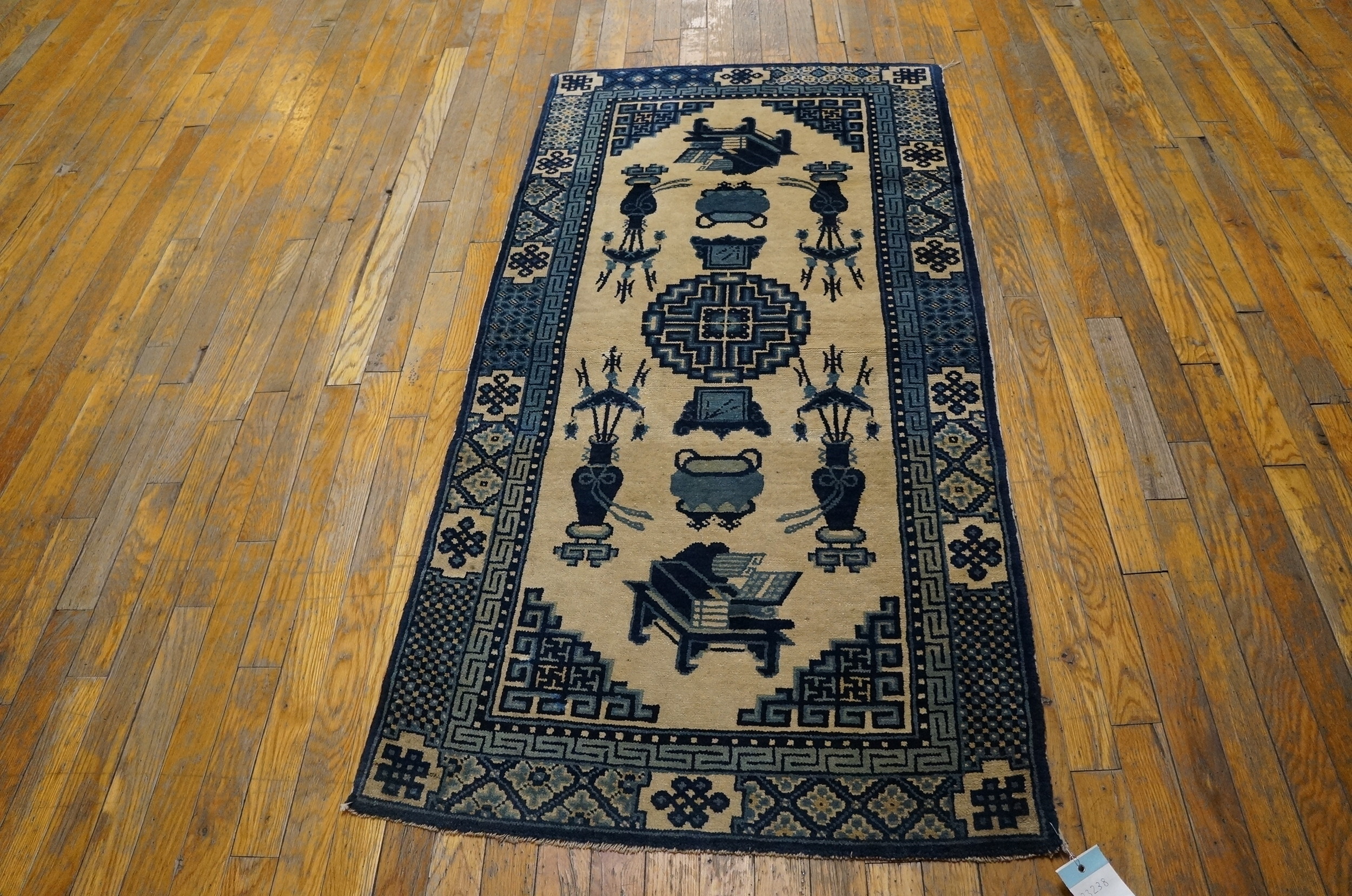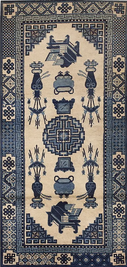 The finely hand-knotted wool pile retains a remarkable depth of color, characteristic of high-quality antique production. The field is dominated by a serene palette of ivory Beige Cream White, which provides a luminous backdrop for the symbolic Chinese scholar’s objects depicted throughout the composition. This restrained use of color highlights the precision of the drawing and the clarity of the wool’s texture.