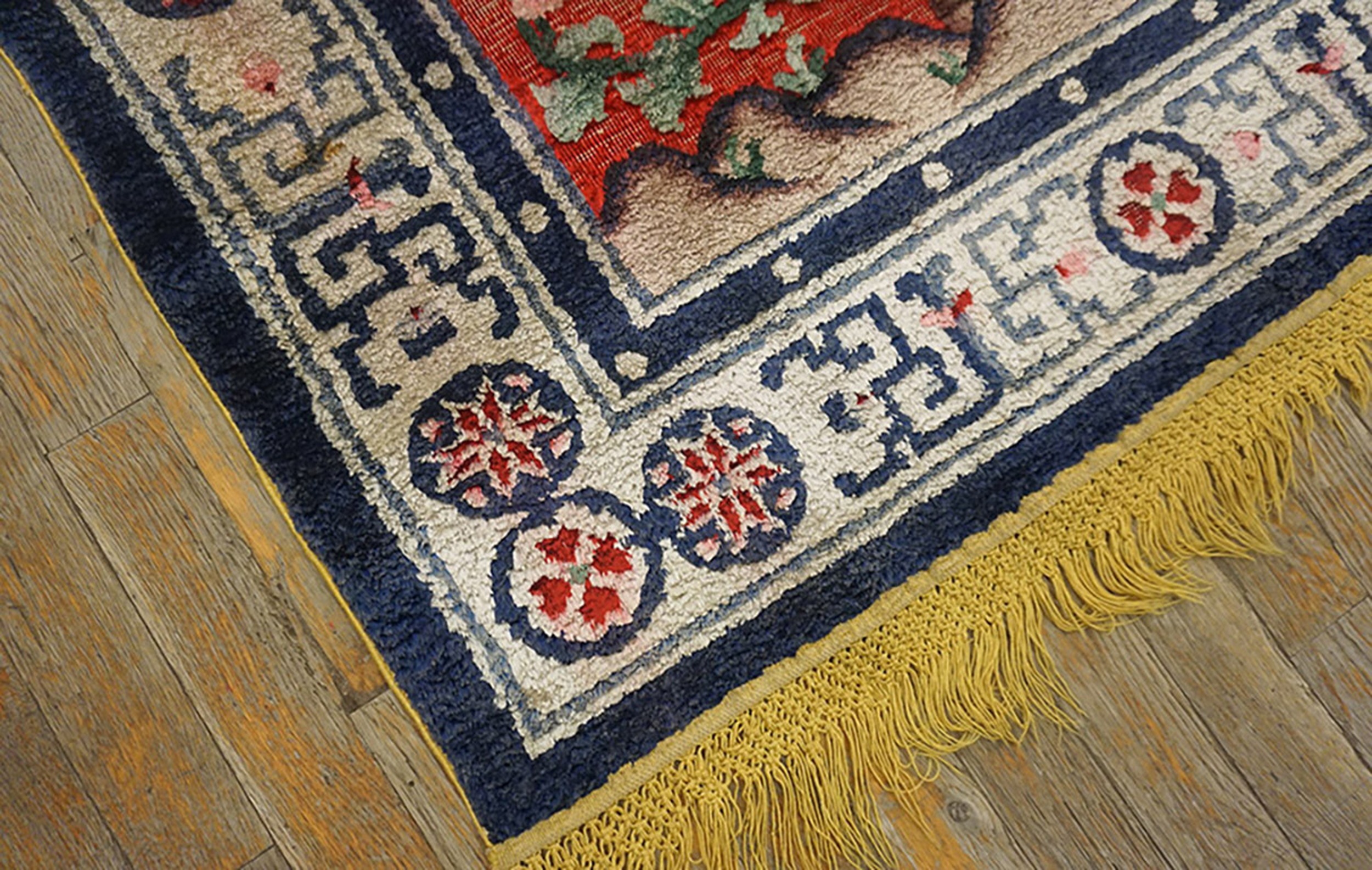 The border system is complex, utilizing both geometric fretwork—a classic element in Chinese rugs—and alternating round medallions filled with abstract floral forms. This careful balance between curvilinear naturalism in the field and structured geometry in the guard bands is typical of the sophisticated aesthetic developed in China during this period.