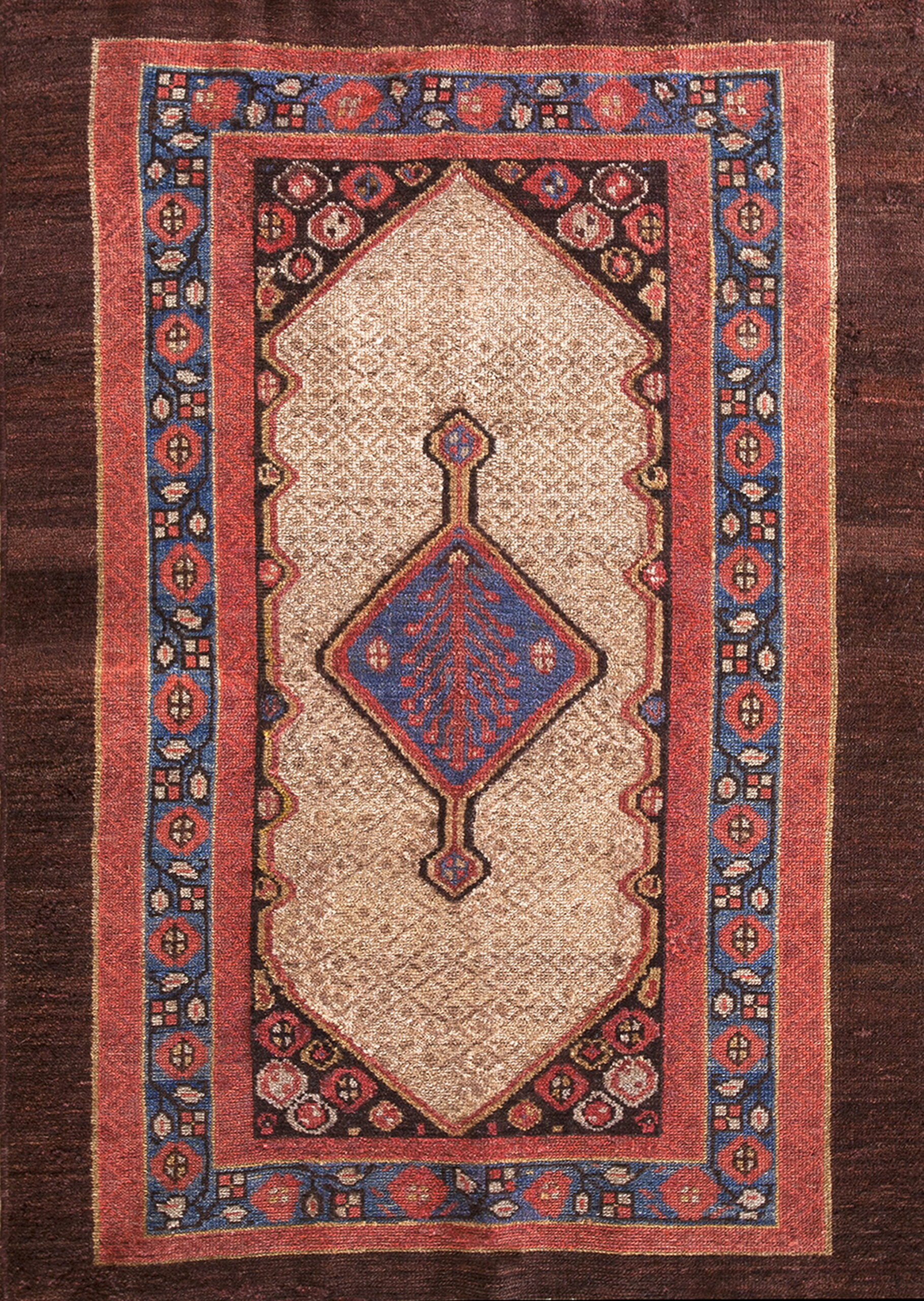 A series of meticulously drawn guard borders frame the main field. These borders utilize rich, earthy tones of terracotta and deep blue, showcasing the masterful use of natural dyes prevalent in the late 19th century. The intricate detailing within the borders provides visual texture and anchors the expansive, open field, demonstrating a sophisticated use of negative space.