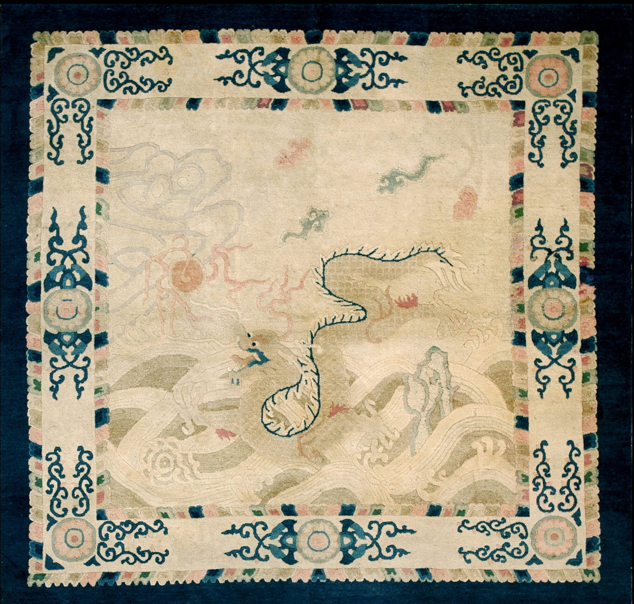 The central area features a dynamic, subtly rendered scene of dragons emerging from stylized waves and clouds—a classic imperial motif. Unlike many contemporaneous pieces that employ a strict medallion layout, the design here flows across the entire field, creating an immersive allover design that is both powerful and ethereal.