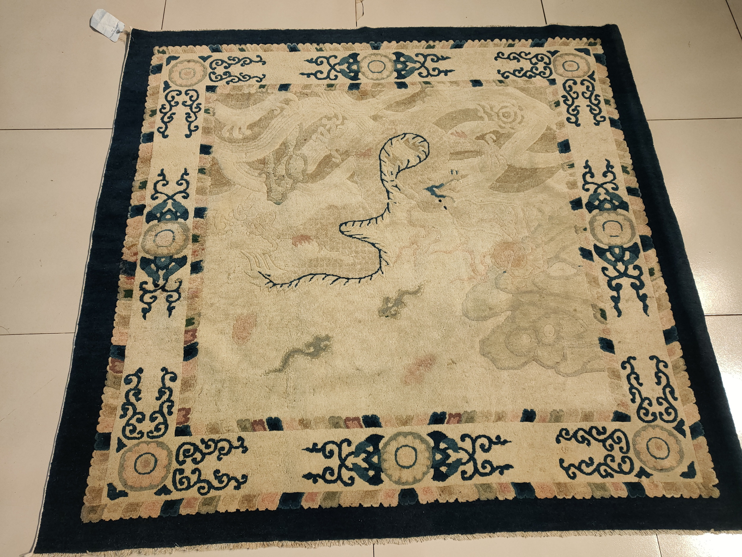 Small Scatter Size Antique Wool Square 1900s Chinese – Peking Knotted Ivory Rug, Circa Date: 1900s. This exceptional Chinese Peking piece captures the restrained elegance characteristic of early 20th-century weaving. Its unusual square format and small scatter size make it a highly versatile decorative accent, perfect for defining intimate spaces or serving as a wall hanging.