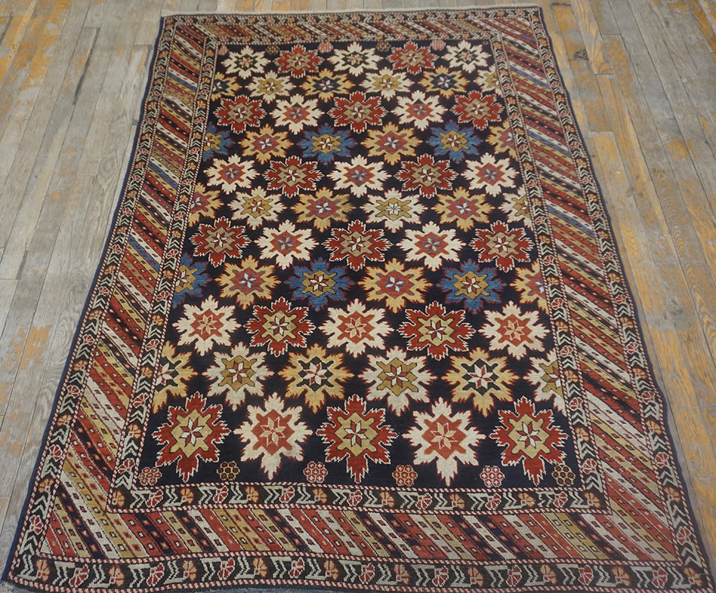 The field is dominated by a powerful, repeating pattern of stylized stellar medallions set against a deep indigo ground, creating a mesmerizing, classic Caucasian allover rugs design that minimizes the negative space. The complexity of the drawing suggests the work of a master weaver operating within the established village tradition.