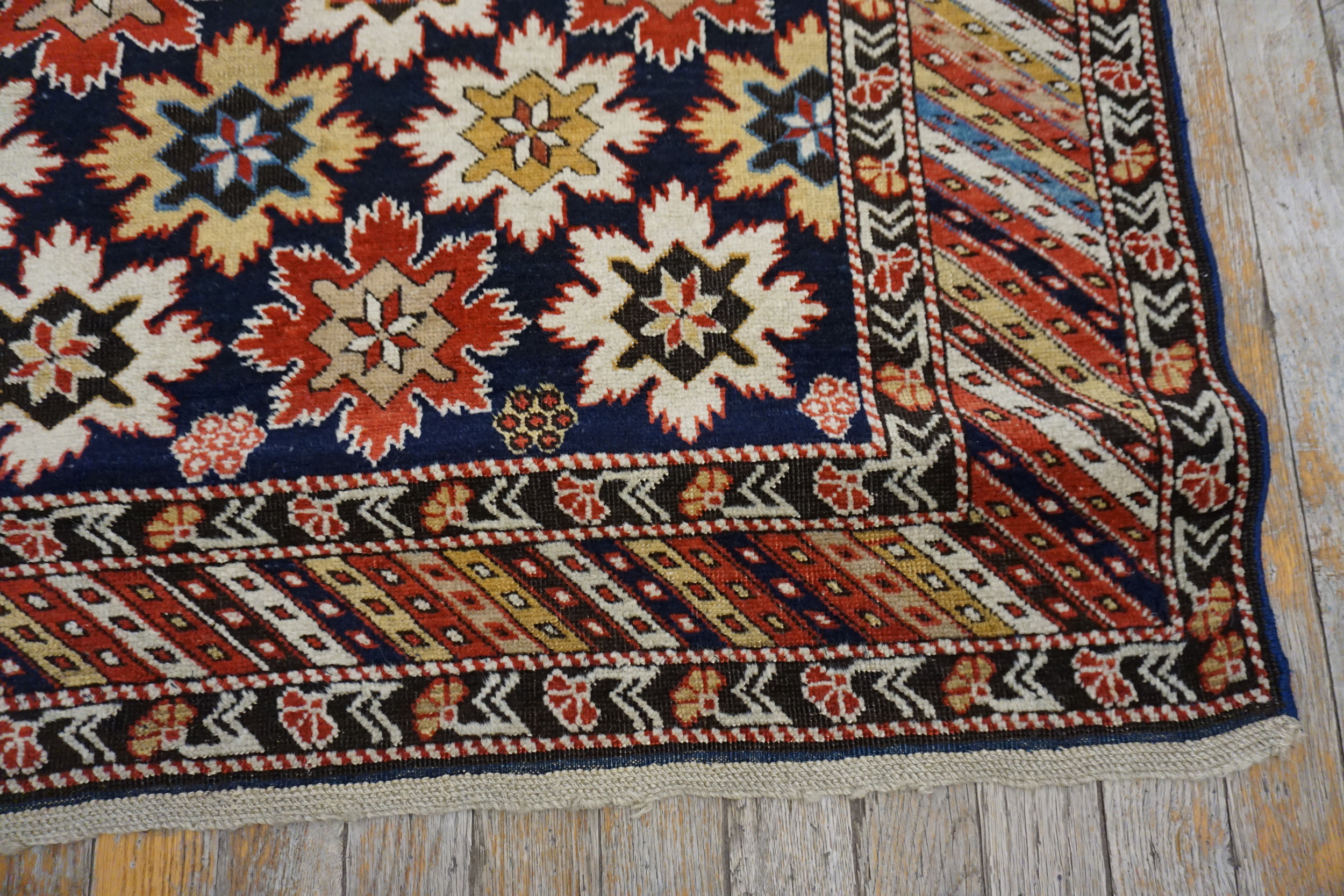 Framed by a multi-layered border system featuring characteristic diagonal stripes and geometric guard bands, this piece maintains superb visual integrity. Its dimensions classify it among the desirable small scatter size rugs, making it an ideal accent for a sophisticated interior or a significant addition to any collection of tribal Caucasian weavings.