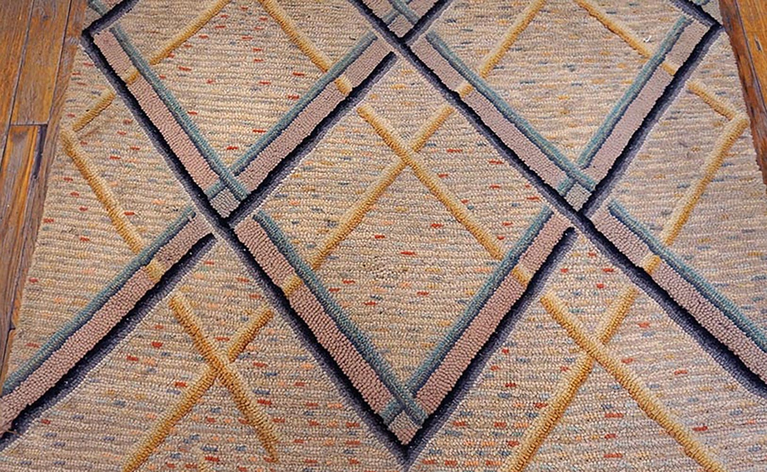 Small Scatter Size Ivory 1920s Hooked American Antique Wool Rug, Circa Date: 1920s. This striking example of an American hooked rug captures the sophisticated geometric aesthetic of the Art Deco era through its bold structure and restrained palette. The dense, looped texture of the hooked wool lends a unique, tactile quality to the surface, distinguishing it from traditional woven textiles.