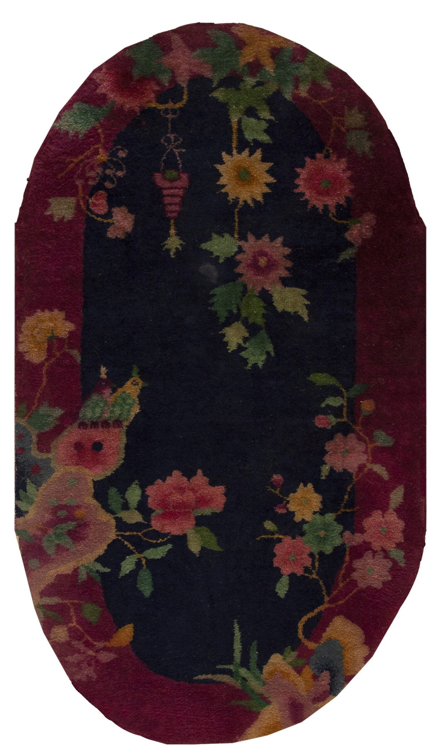 Stylized blossoms, trailing vines, and a whimsical bird motif populate the perimeter, contained within a rich, magenta-toned border. The open composition and bold, graphic rendering of the natural elements are hallmarks of the Chinese Art Deco style, prioritizing visual impact over dense pattern work.