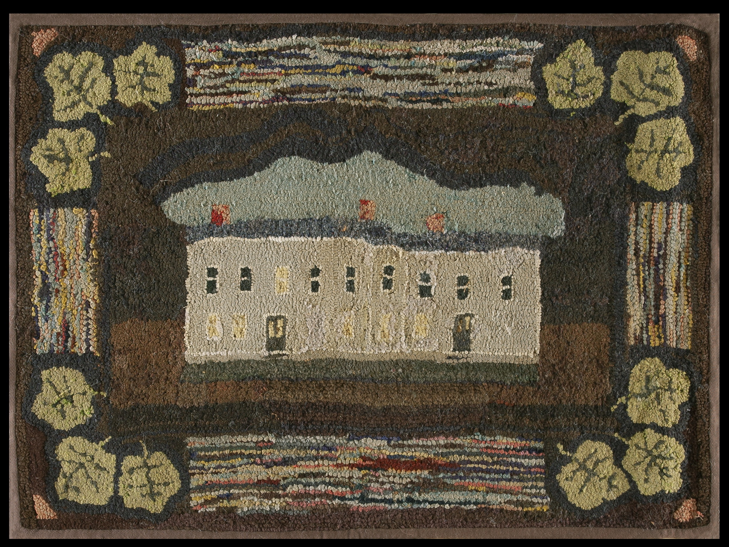 The primary field features a large, stylized depiction of a substantial stone or clapboard house, set against a dark, earthy ground. The palette is rich in natural tones—deep browns, charcoal, and muted sage green for the roof and surrounding landscape—creating a somber yet inviting scene. The border, however, introduces a striking contrast with stylized leaves, aligning it with traditional floral rugs often found in decorative arts.