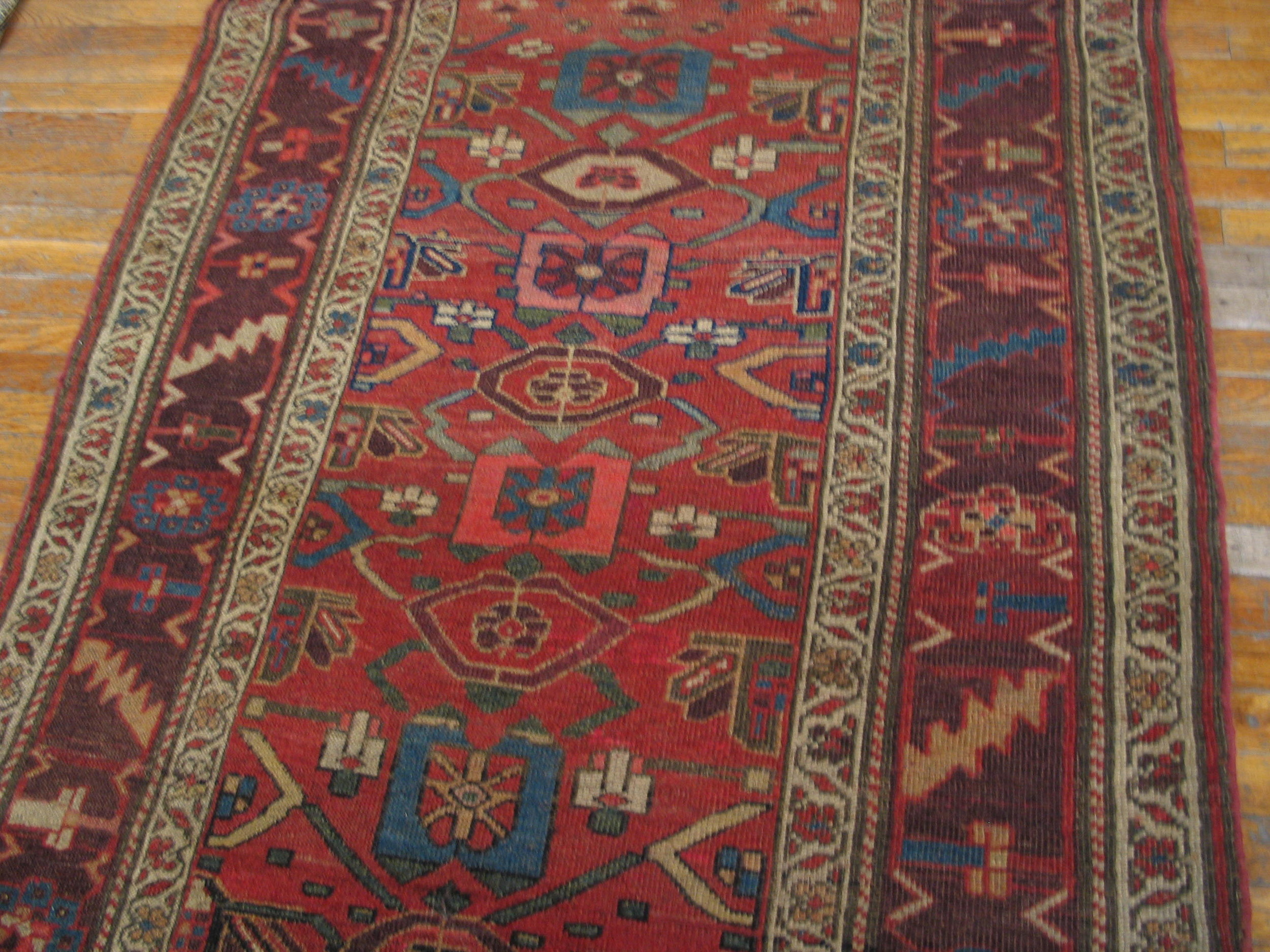 Characteristic of the Kurdish weaving tradition, the field features a highly stylized, dense arrangement of angular medallions and stylized boteh forms. The composition employs an allover pattern structure, ensuring that the intricate details remain captivating regardless of the rug’s orientation or placement within a room.