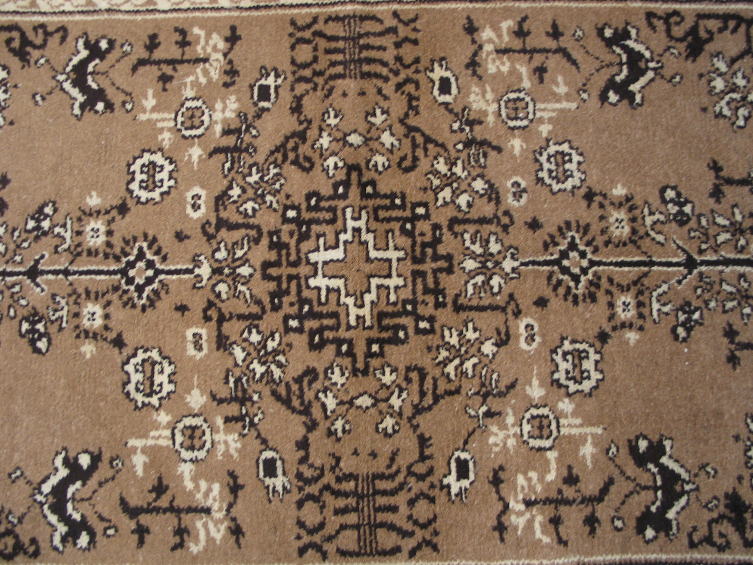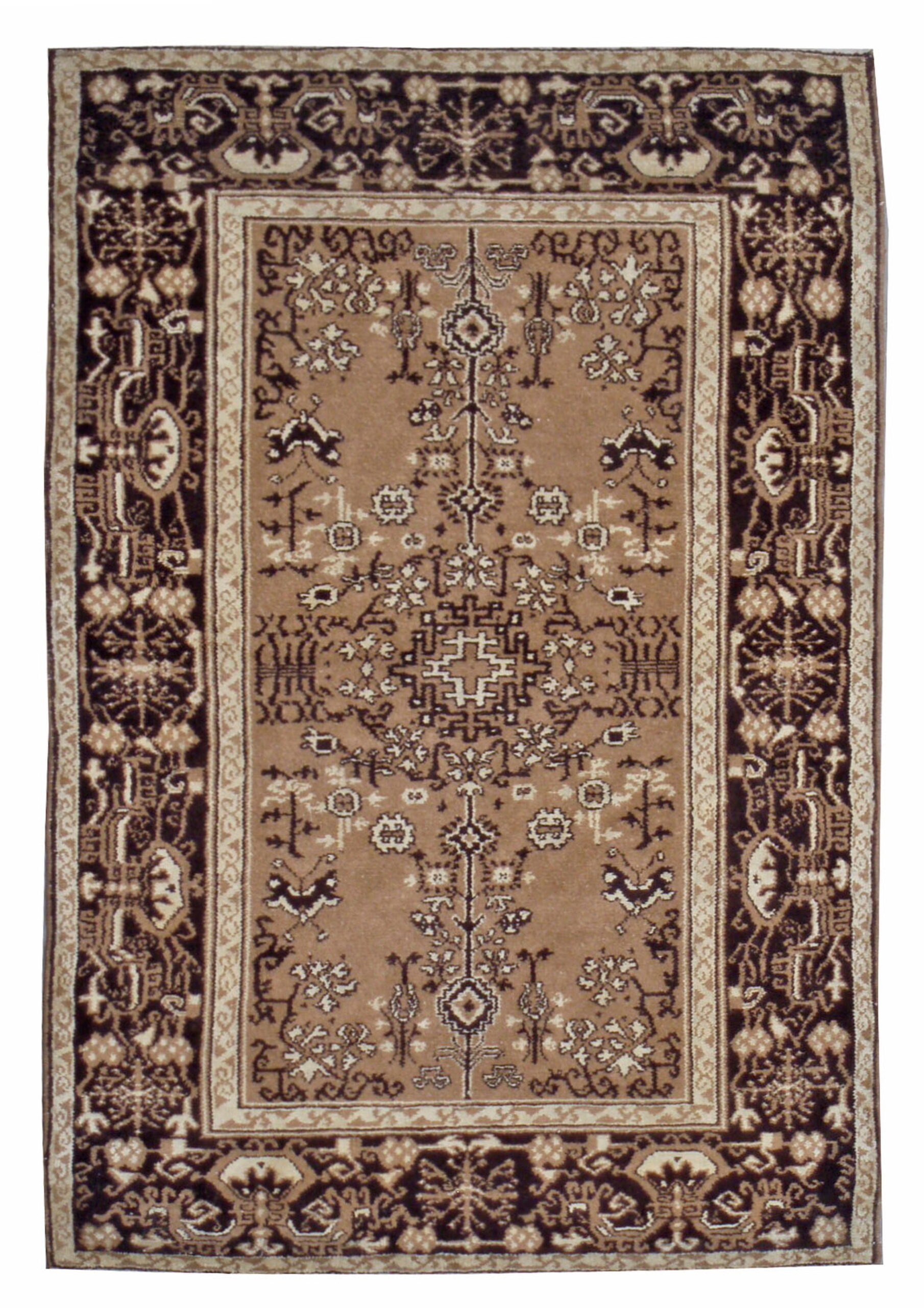 The palette is defined by rich contrasts, featuring a warm, camel-toned field framed by deep espresso and cocoa hues in the primary border. This masterful use of natural dyes creates a grounding and elegant brown earth-tone color scheme, perfect for integrating warmth into modern or traditional interiors.