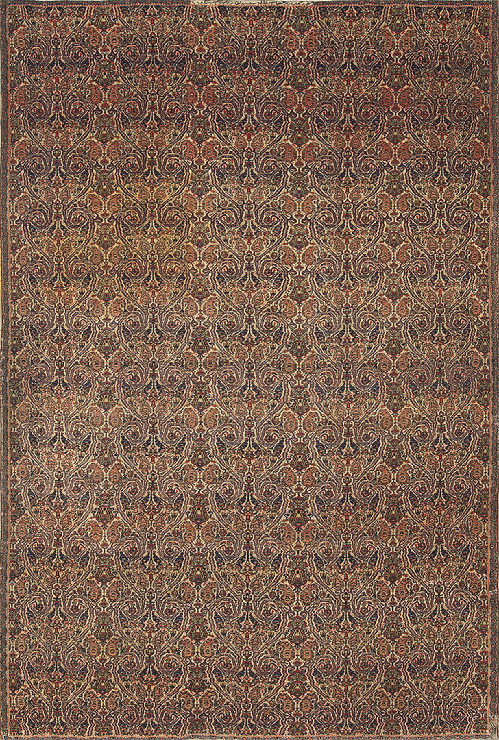 Displaying a meticulously rendered repeating arabesque, the composition is a masterpiece of controlled complexity. This dense, continuous structure, where the motifs cascade seamlessly across the field without the interruption of a central element, is known as an allover rugs design, ensuring visual interest across the entire surface.