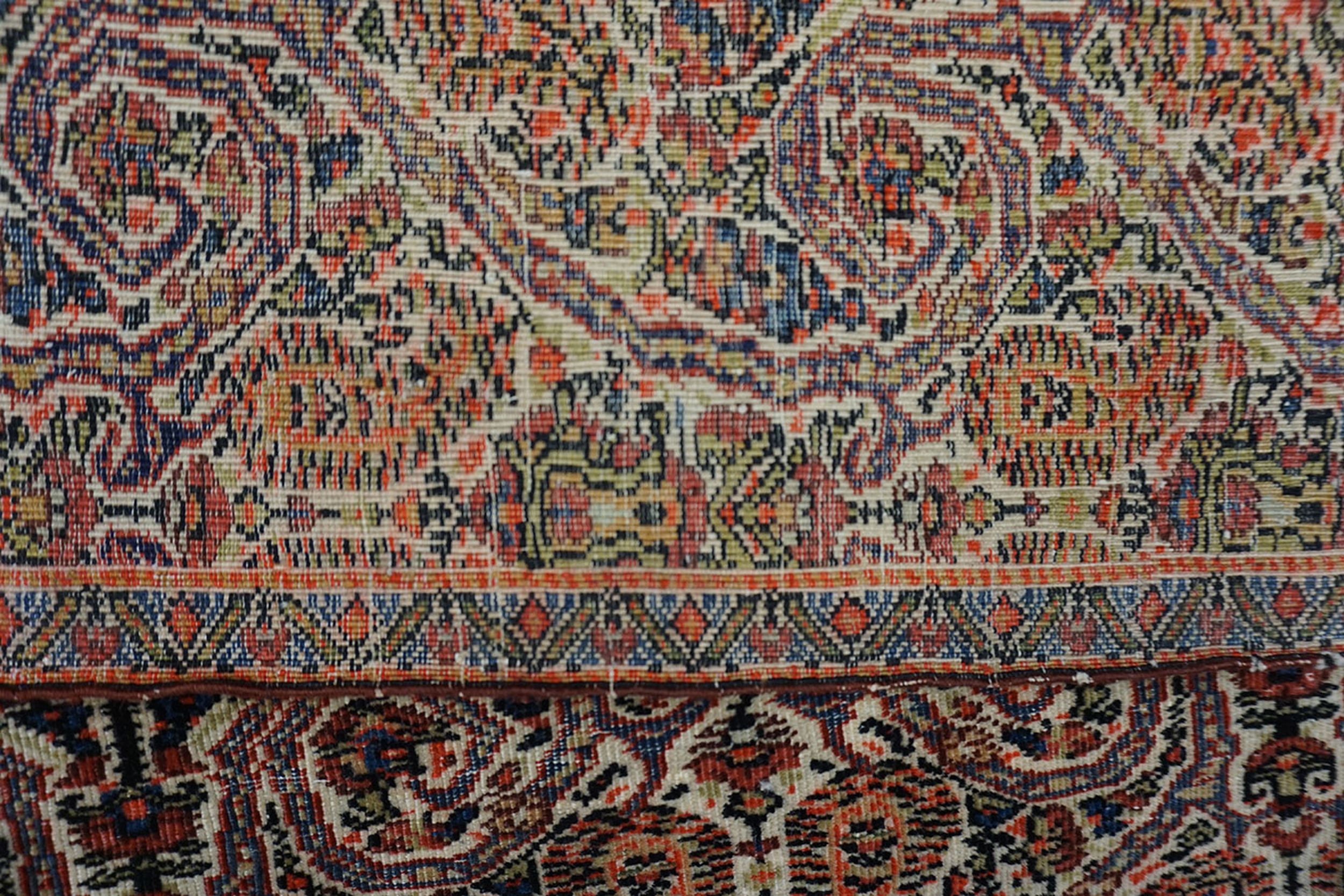 The sophisticated colorway is built upon a subtle, aged ivory ground, which provides a luminous contrast to the rich secondary colors of madder red, deep indigo, and oxidized greens. The use of an ivory color rugs field is characteristic of highly sought-after Farahan pieces, allowing the complex pattern to breathe despite its density.
