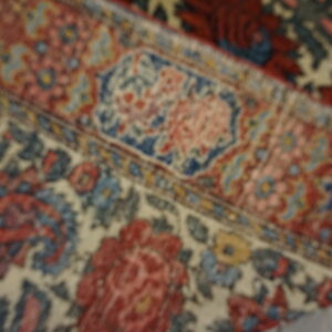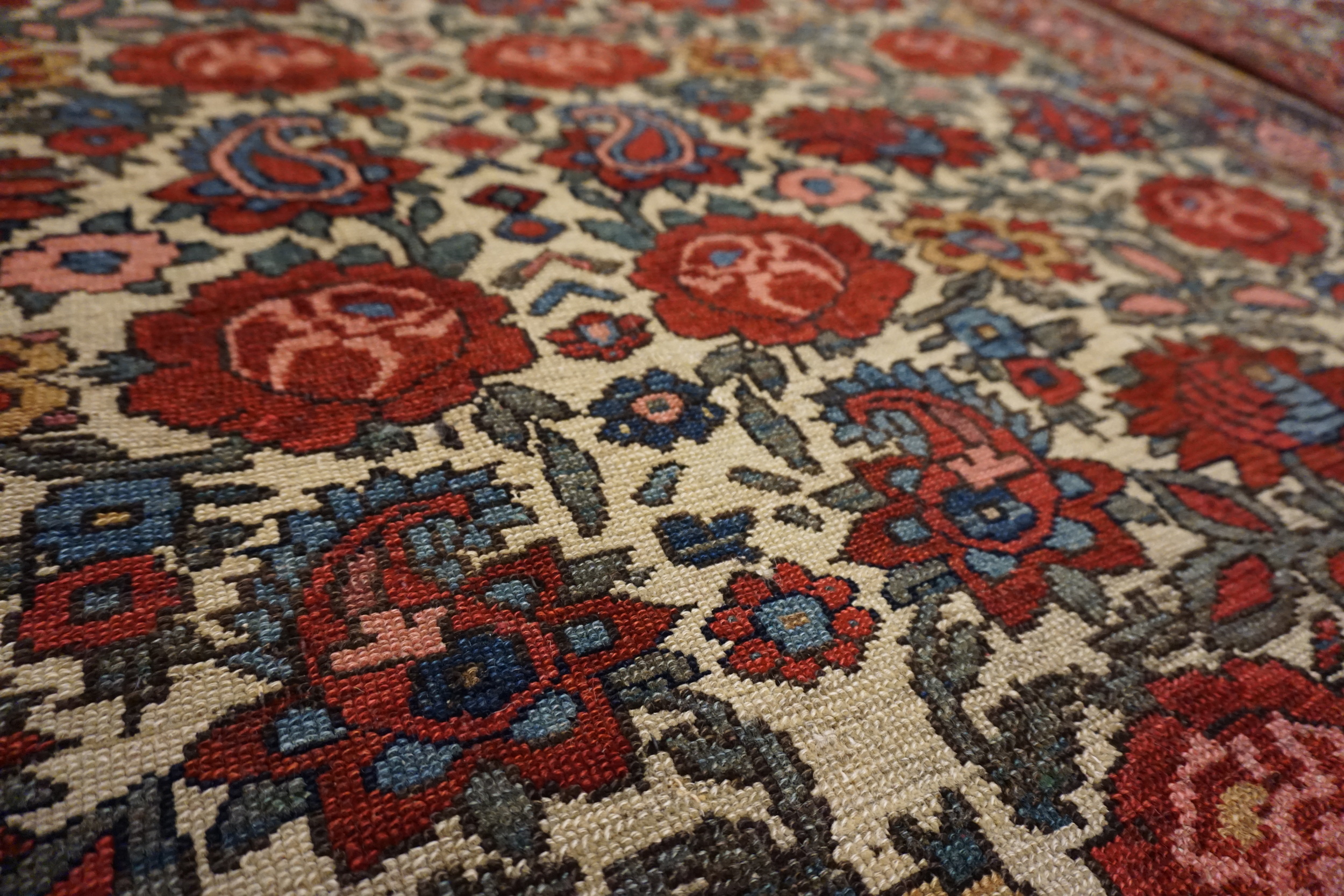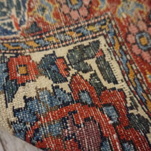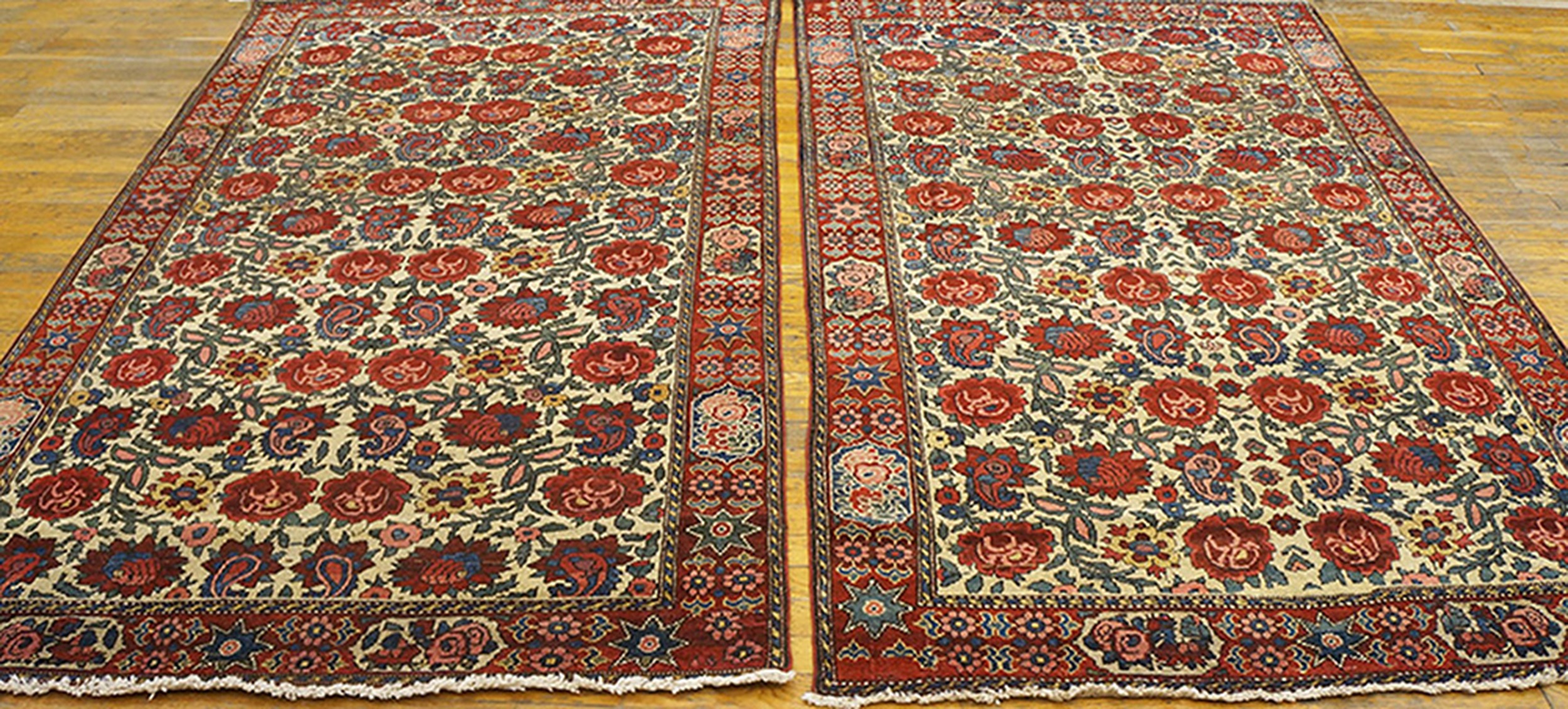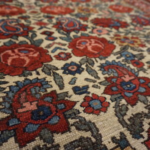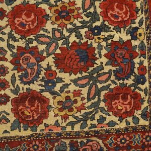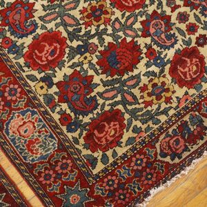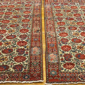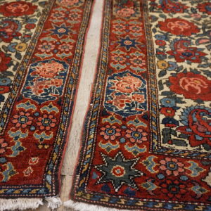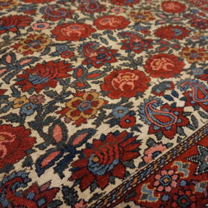 Each of these antique Persian area rugs features a soft ivory field that provides a luminous foundation for its more intricate ornamentation. Against this backdrop, a floral paisley motif unfolds with rhythmic grace, blending botanical forms and curvilinear shapes in a composition that feels both lively and balanced. The paisley rug design pattern — with roots in Persian design history — adds a timeless decorative accent, while the floral elements enhance the rugs’ organic warmth.