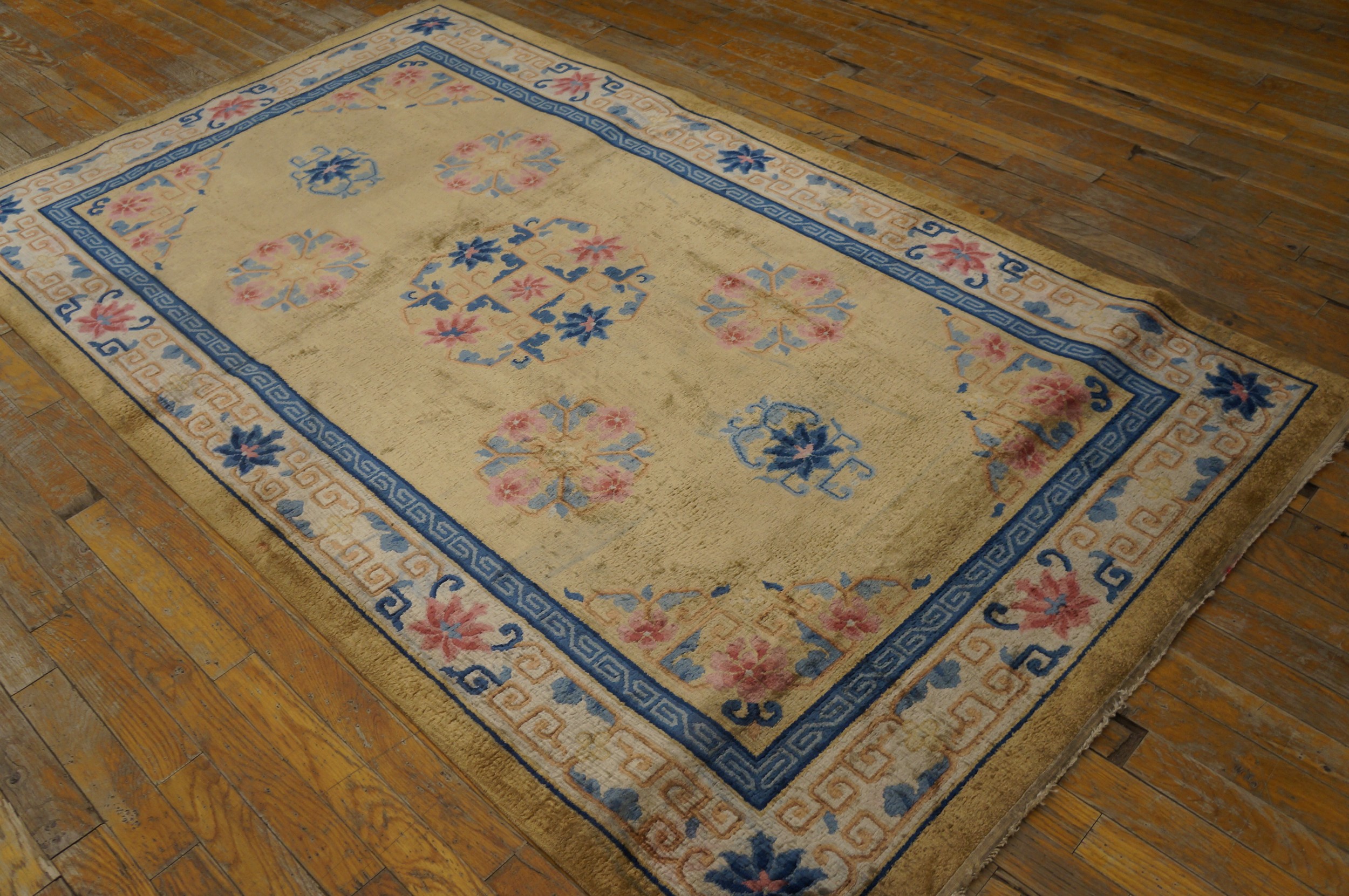 The ornamentation features delicate circular floral clusters rendered primarily in dusty rose and pale sky blue, anchored by deeper navy elements that provide necessary visual weight. The structure is defined by a bold, double border incorporating a classic meander pattern, a characteristic often sought after in antique rugs of this period.