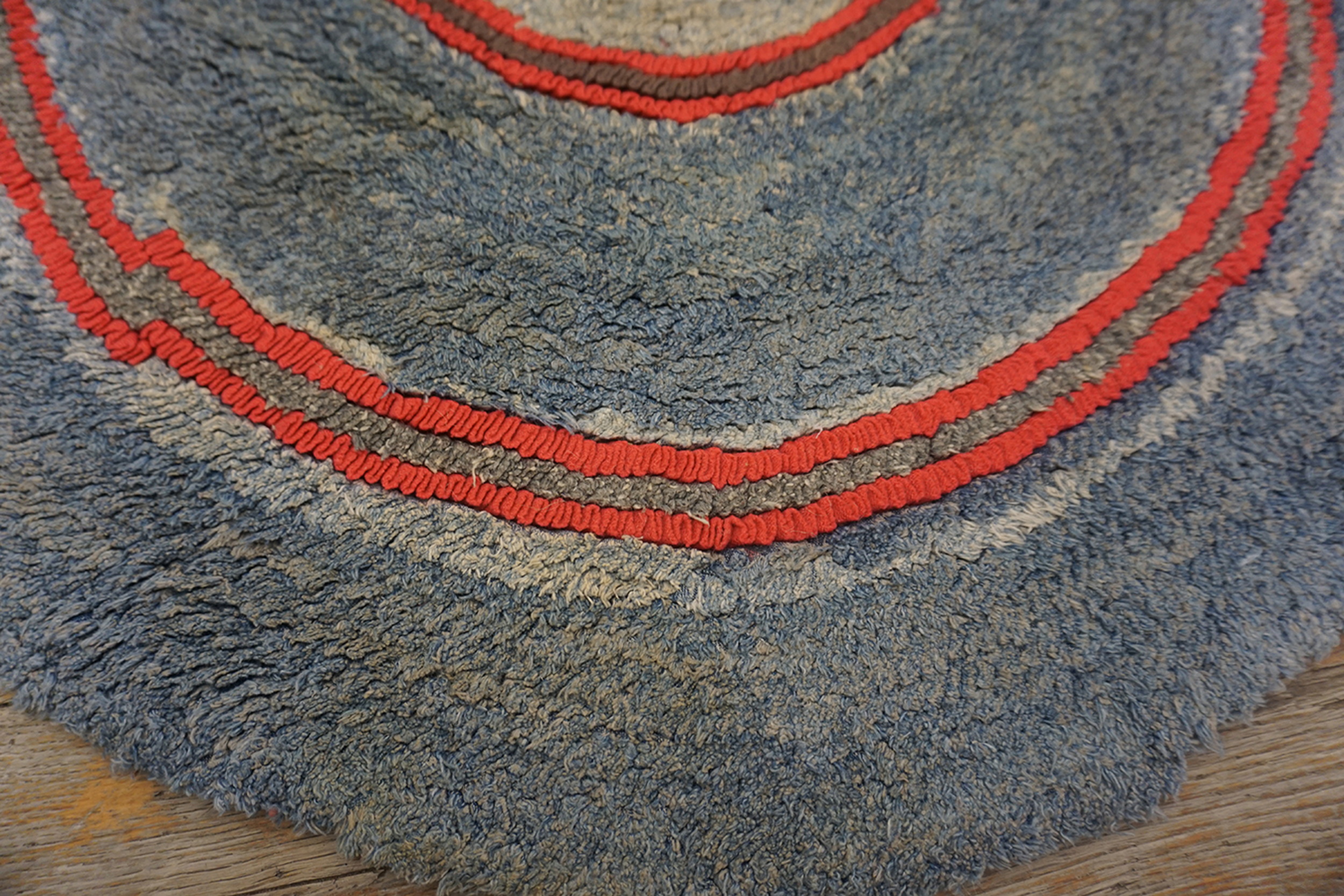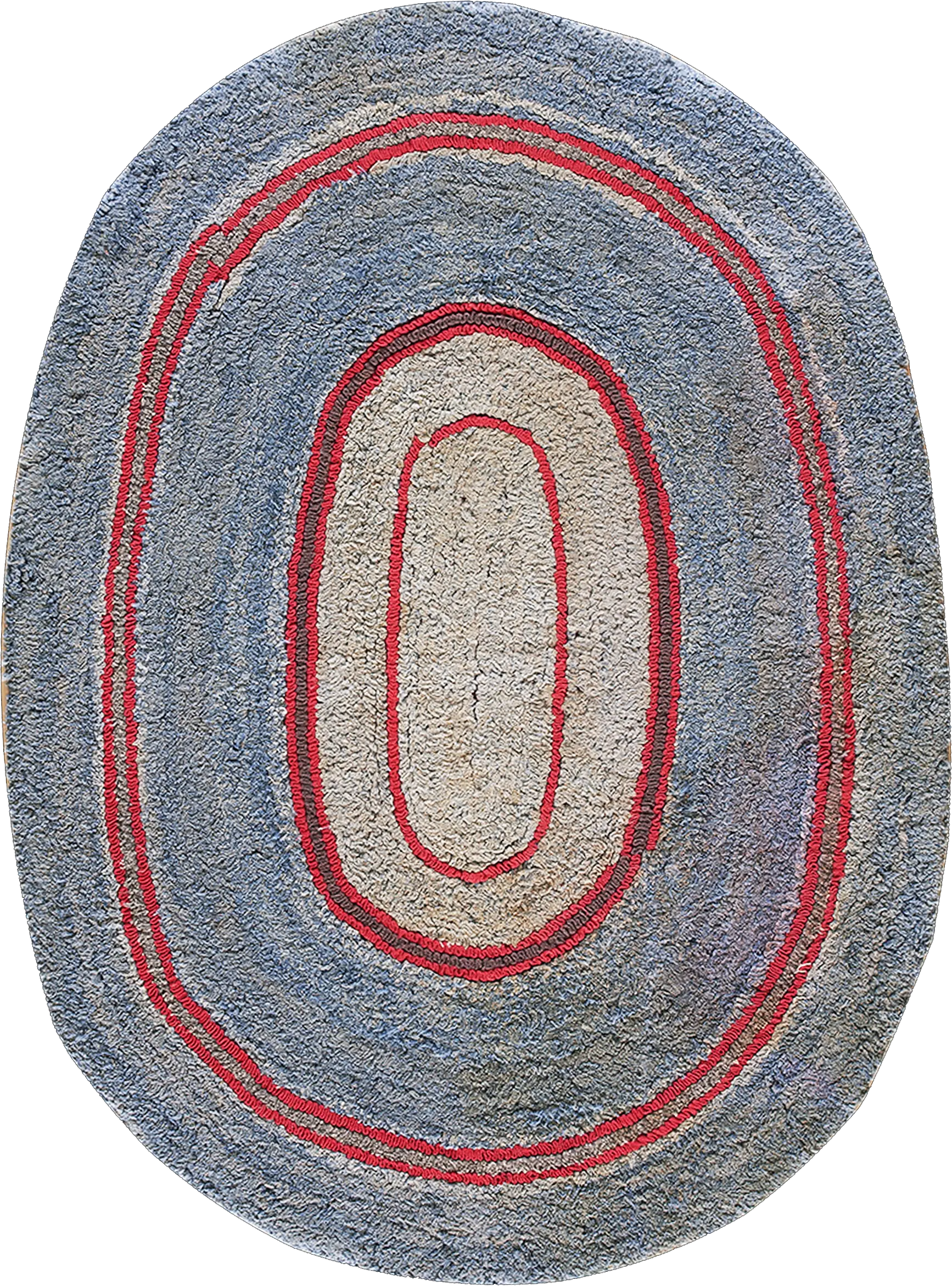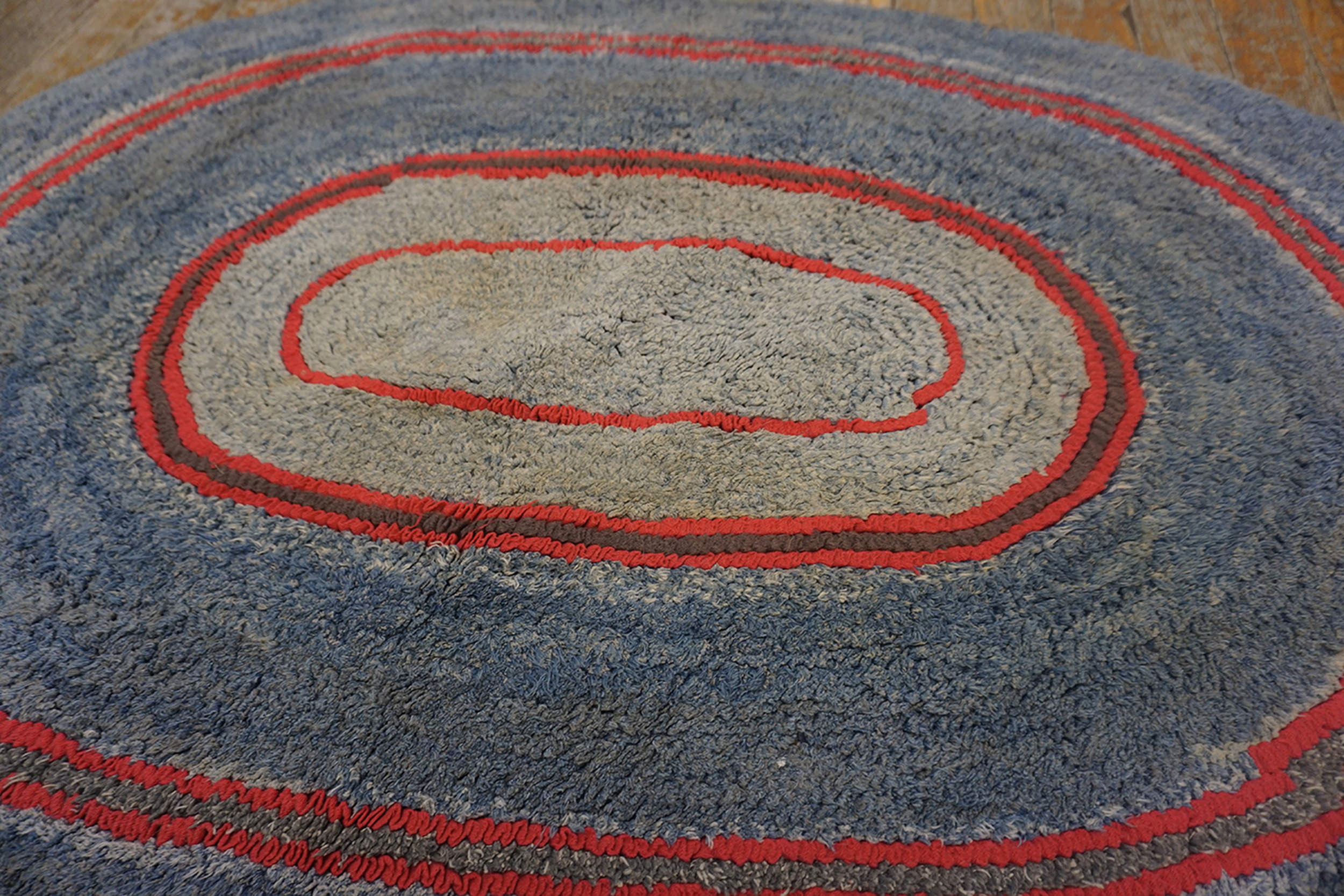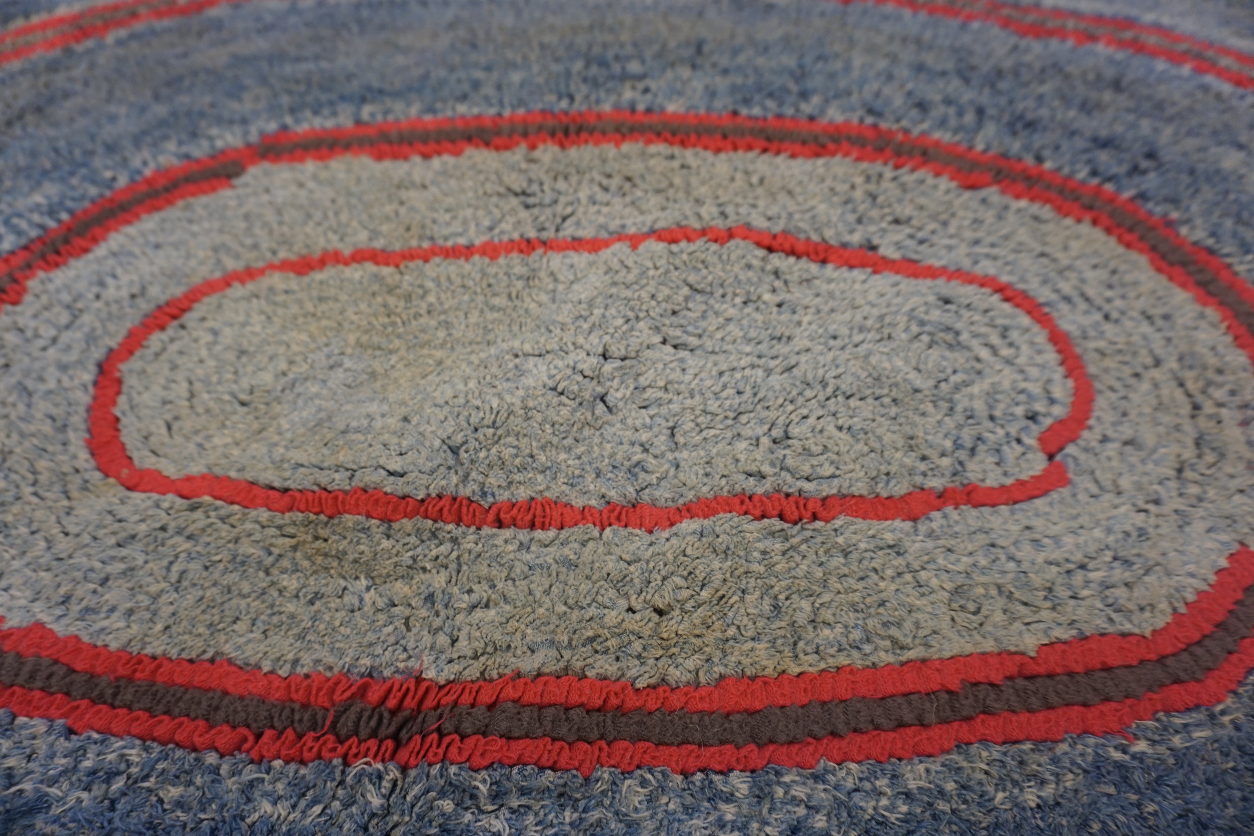 Antique American Hooked Rug American Blue 1925, Circa Date: 1925. This exceptional example of American textile folk art represents the enduring tradition of domestic craftsmanship. Unlike highly formalized Persian or European weaving, these hooked pieces possess an immediate, textural charm, making them sought-after additions to collections of antique rugs.