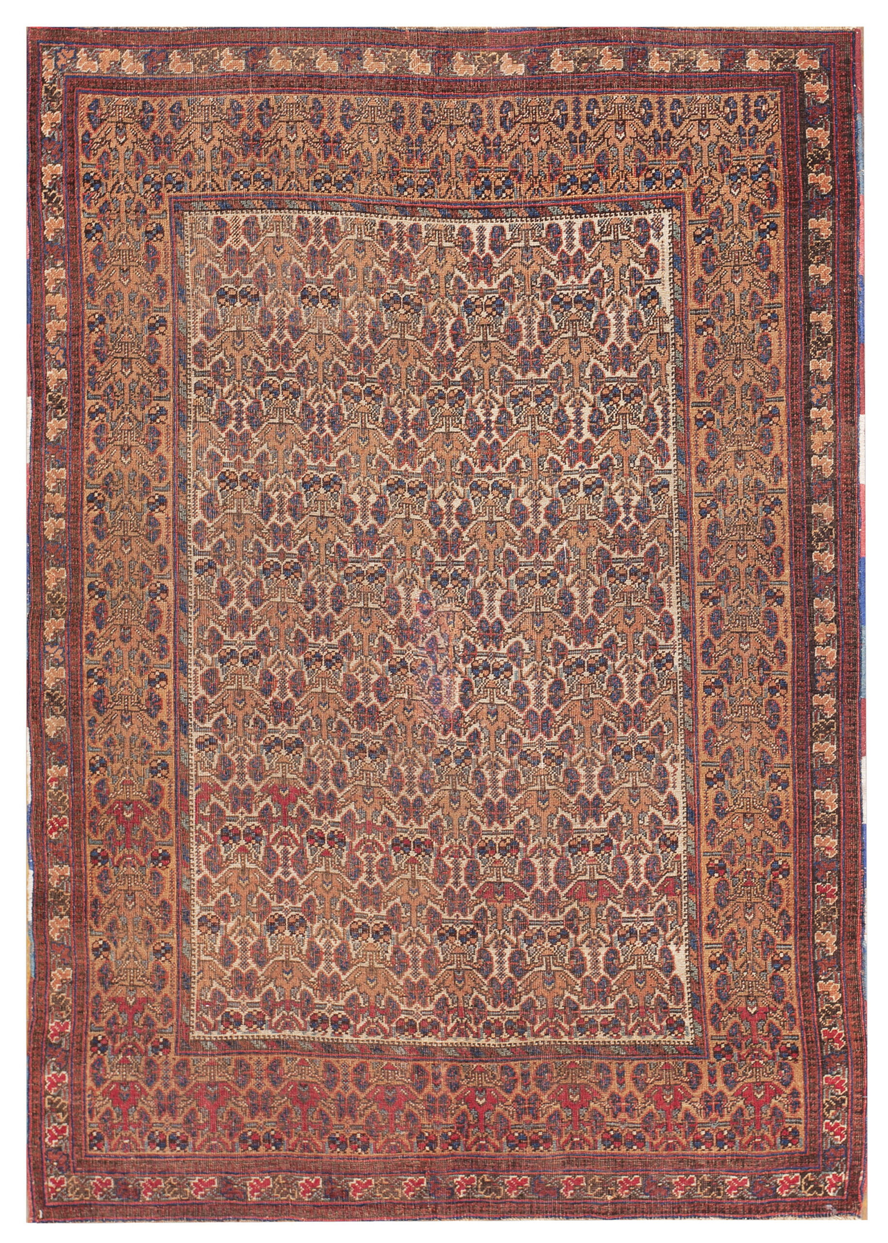 Characterized by a highly detailed, repeating geometric structure, this piece utilizes an allover design that eschews a central focal point in favor of continuous visual movement. The intricate patterning is typical of Afshar village work, showcasing stylized floral and animal forms rendered in abstract, angular precision.