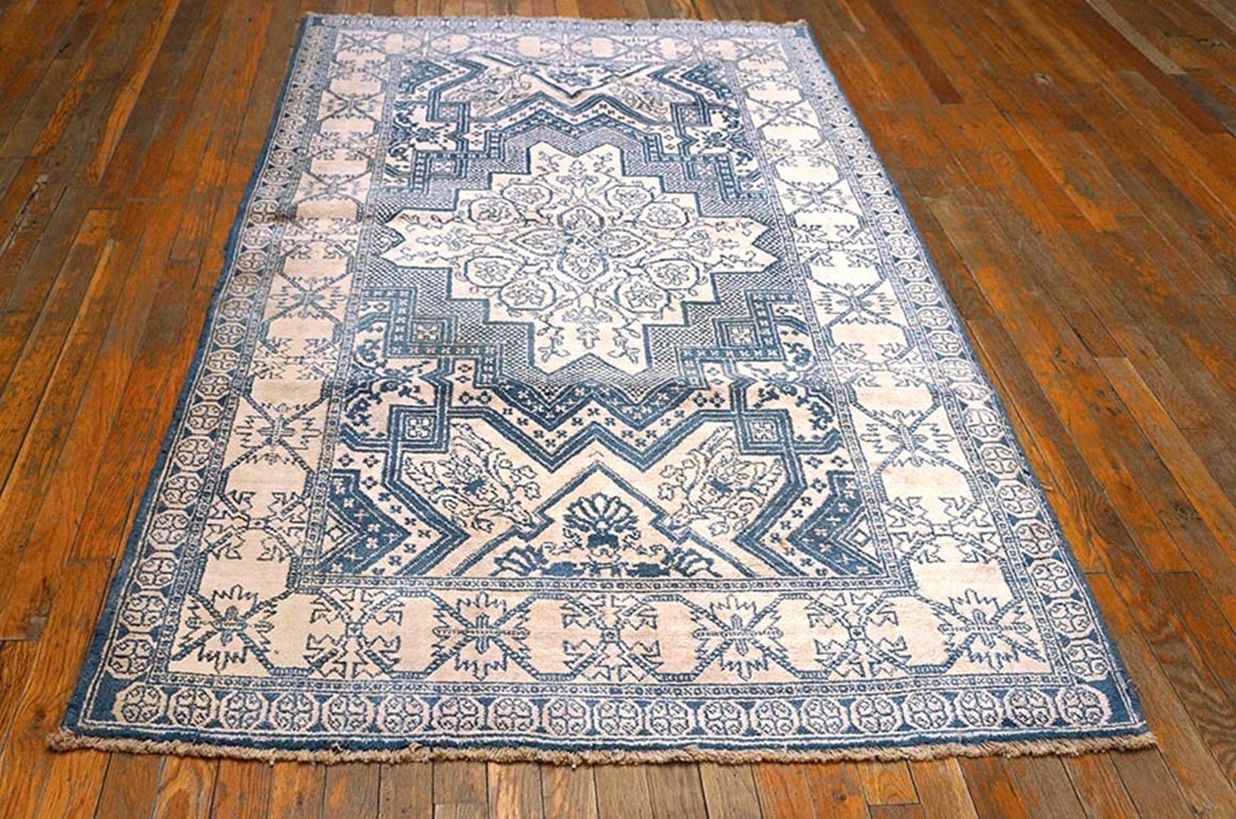 Antique Agra – Cotton Indian Ivory 1930s Ivory Rug, Circa Date: 1930s. This exceptional Indian Agra piece presents a striking study in contrast, utilizing a dense cotton weave to achieve sharp definition between the saturated indigo blue and the expansive, luminous field. As a fine example of antique rugs from the period, it showcases the highly refined weaving traditions of Northern India.