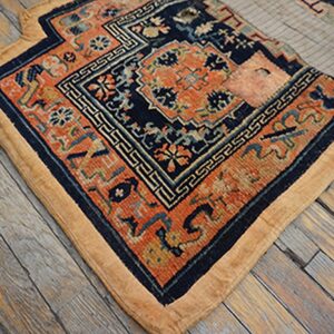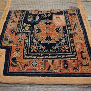 This early 20th-century Chinese rug saddle or horse cover is a rare and highly collectible artifact from the Qing Dynasty, representing a sophisticated category of “Utilitarian Art.” While room-sized antique Chinese carpets were often intended for stationary luxury, these equestrian textiles were crafted for the nomadic movement and ceremonial prestige of the Chinese and Mongolian elite, making them a significant find for connoisseurs of East Asian tribal weaving.