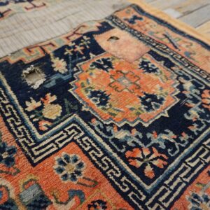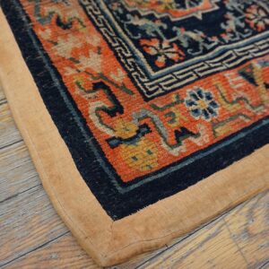 The borders act as a disciplined architectural frame, often mirroring the central motifs to “lock in” the energetic symbolism of the field. Today, these pieces are frequently displayed as textile wall art, where their unique shape and historical gravity serve as a sculptural focal point. To possess this antique Chinese saddle horse cover rug is to own a monument to the equestrian heritage of the Far East—a work that bridges the gap between nomadic utility and dynastic sophistication, transforming any space into a sanctuary of historical soul and rare, silken grace.