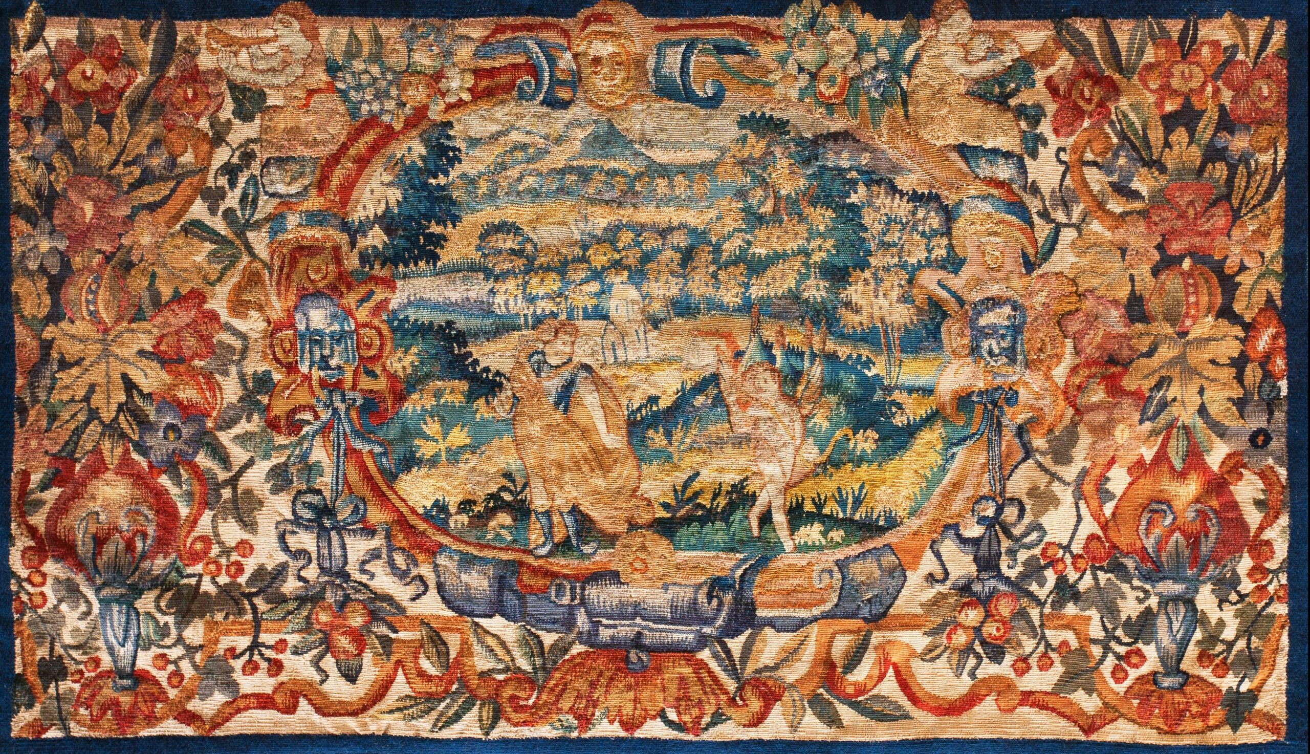 The composition is highly sophisticated, featuring a central oval cartouche depicting a detailed pastoral landscape scene—a common motif in Baroque tapestry work. This central narrative is framed by an exuberant border characterized by lush scrolling vines and highly stylized floral rugs elements, showcasing the period’s fascination with naturalistic ornamentation.