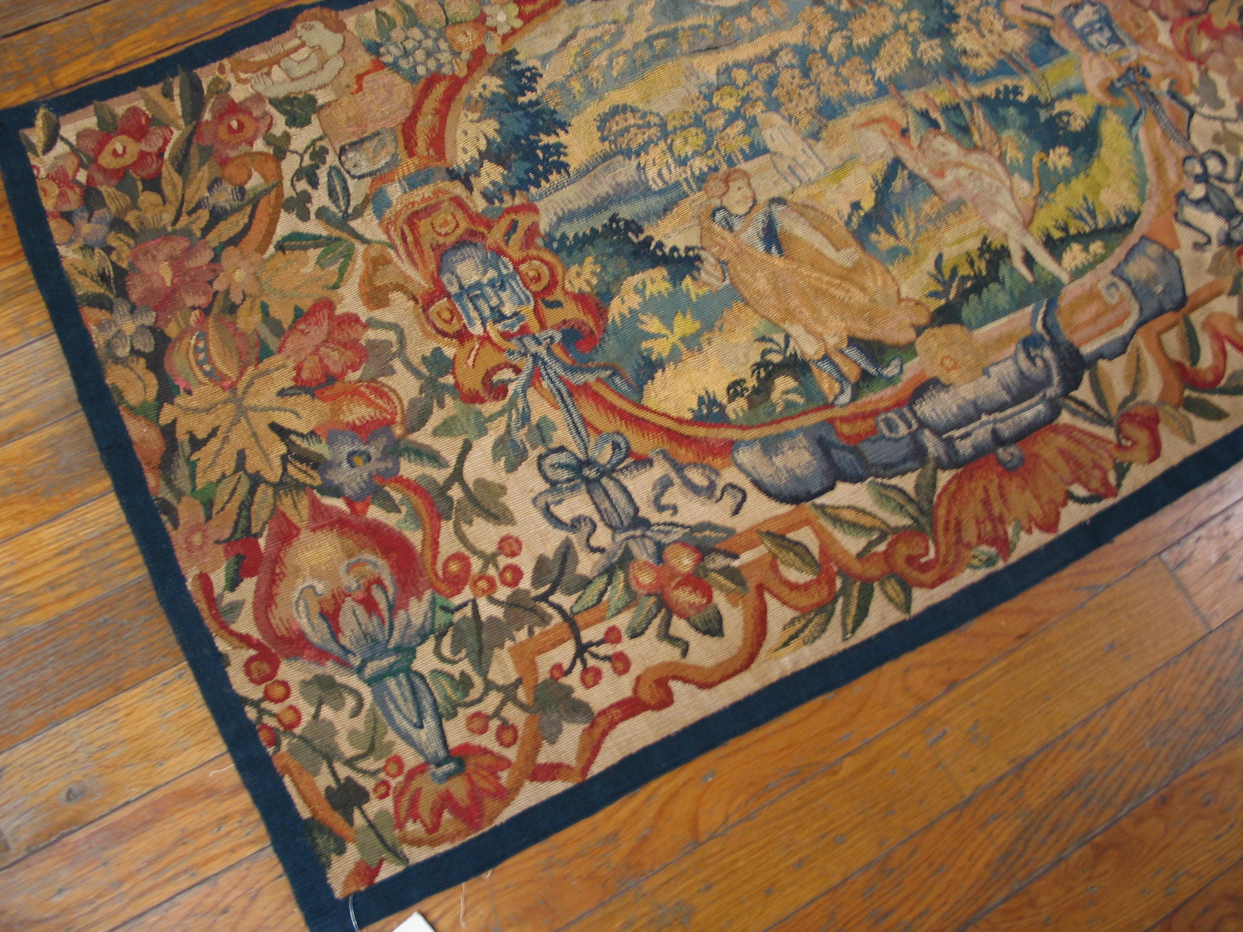 Antique Tapestry Small Scatter Size Wool & Silk Multicolor Rug, Circa Date: 1650s. This exceptional piece, woven with a luxurious blend of wool and silk, offers a rare glimpse into 17th-century European weaving artistry. Its dimensions classify it as one of the highly desirable small scatter size rugs, making it suitable for intimate spaces or as a striking wall hanging.