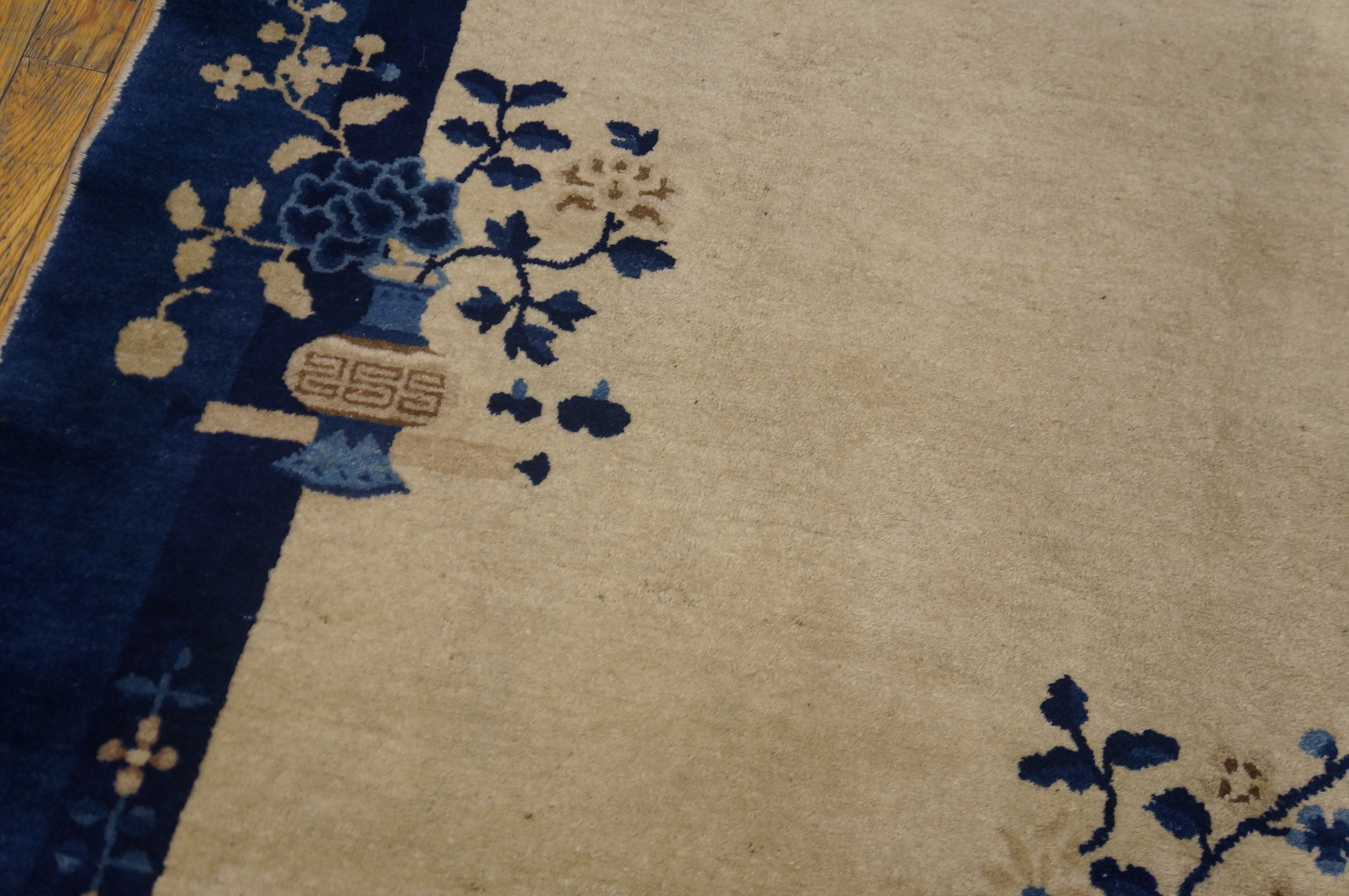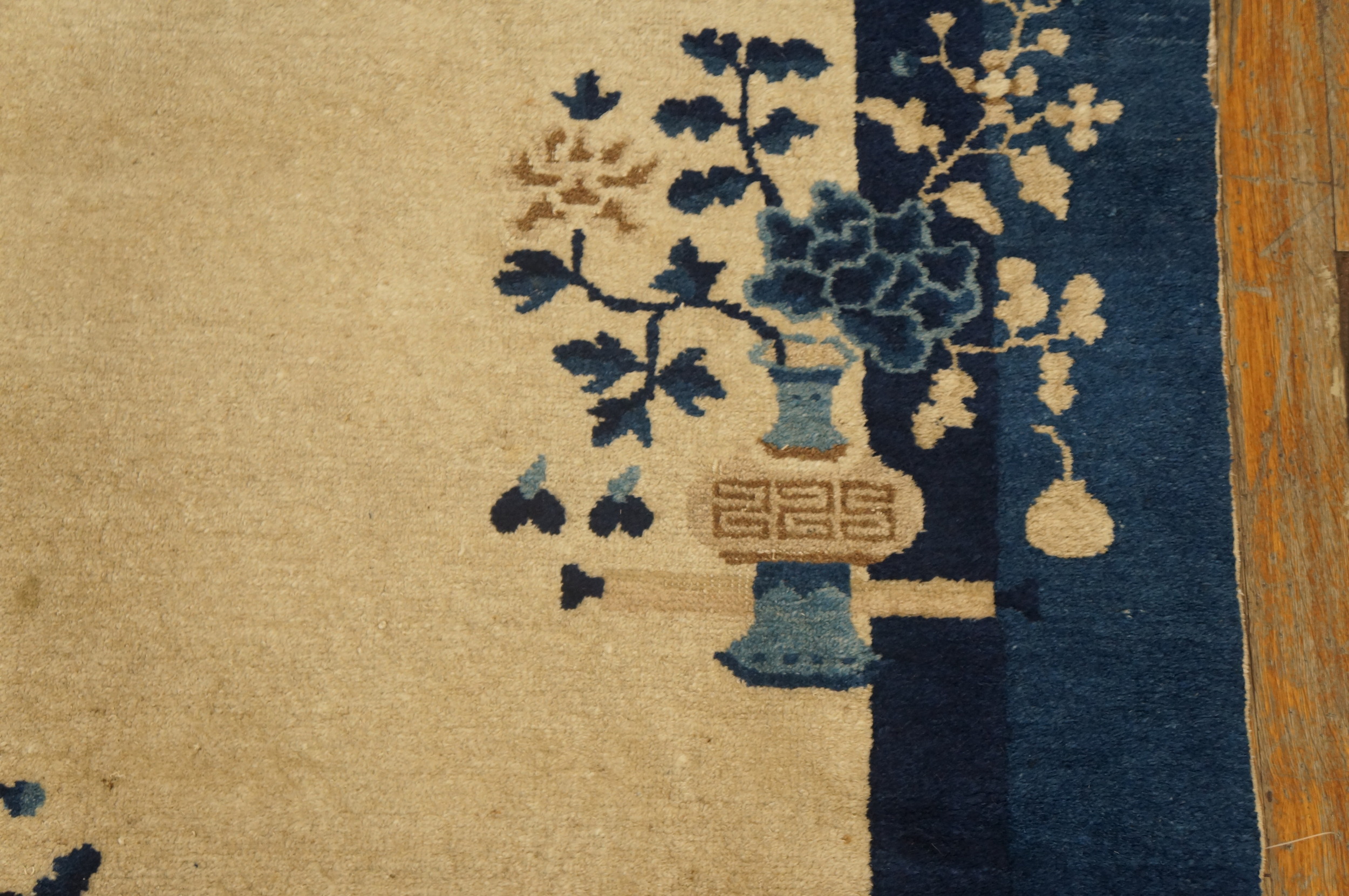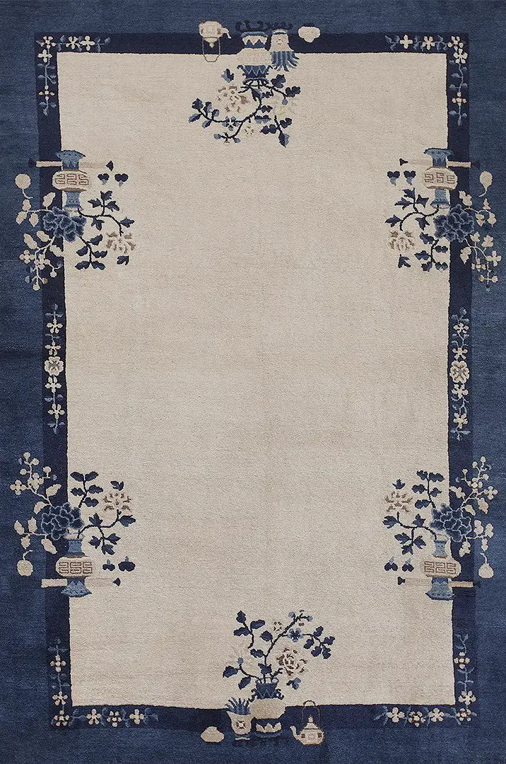 The design features traditional Chinese iconography, including stylized floral arrangements set within vases and planters, carefully placed in the corners and along the lower edge of the central field. These motifs, rendered in varying shades of blue and cream, are hallmarks of the finest Chinese rugs from this period, reflecting a delicate balance between naturalistic representation and stylized formality.