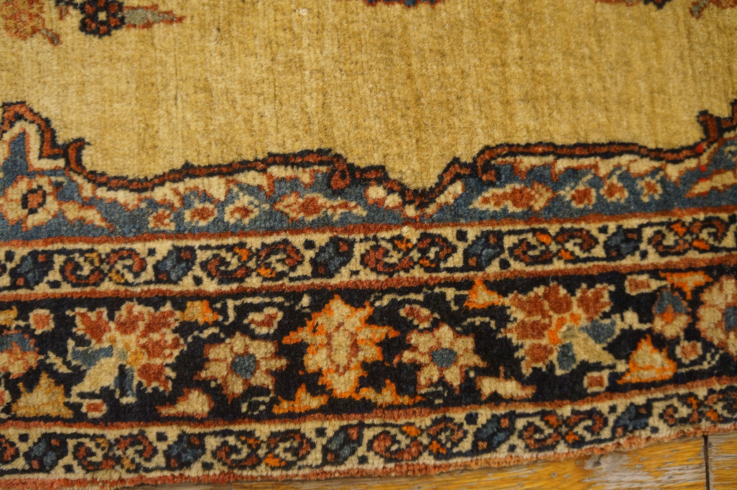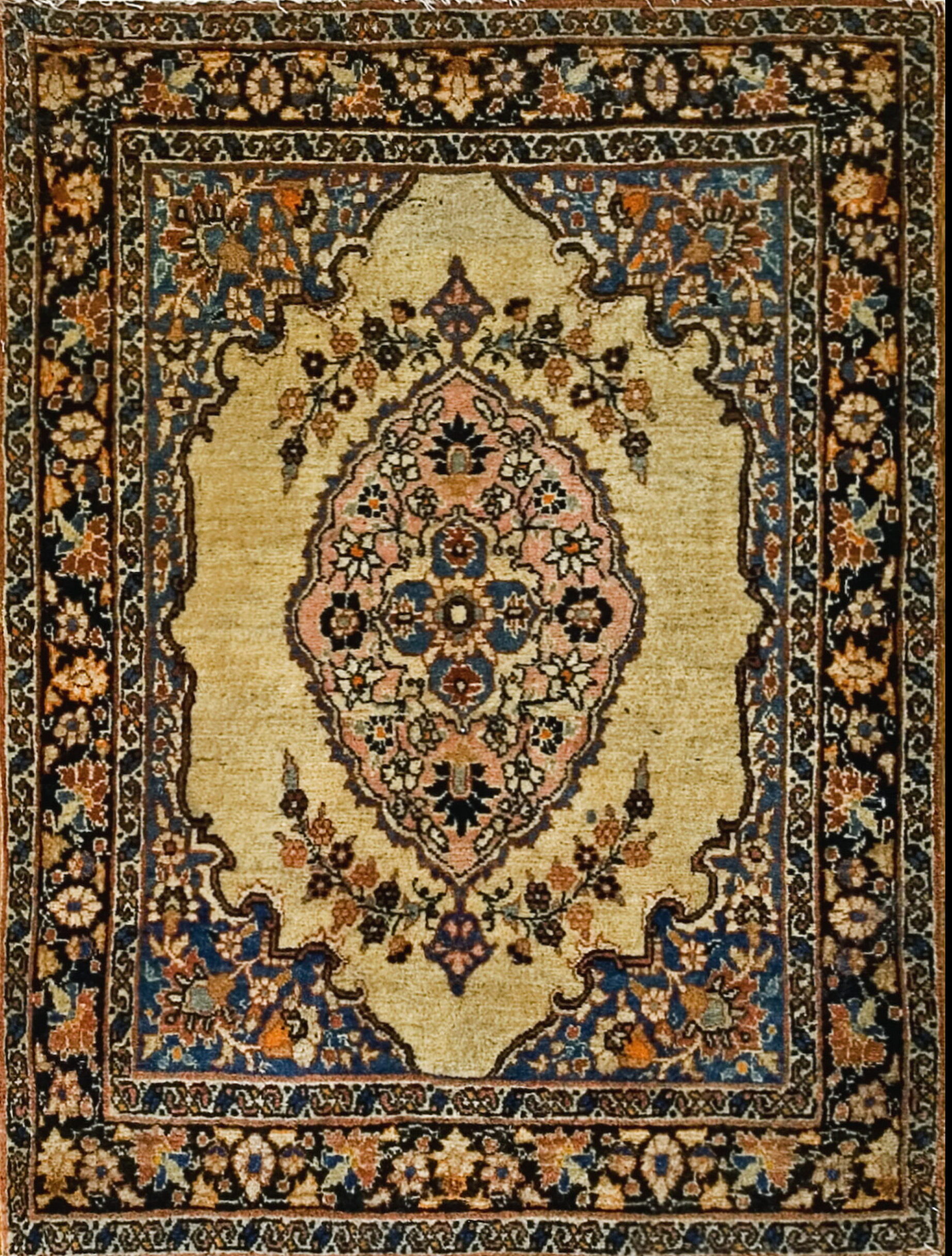 A series of intricately layered borders frame the composition, utilizing dark navy and black grounds to make the secondary floral rugs motifs pop. The precision of the knotting allows for the delicate articulation of vines and blossoms, confirming the master weaver’s skill in executing complex curvilinear designs.