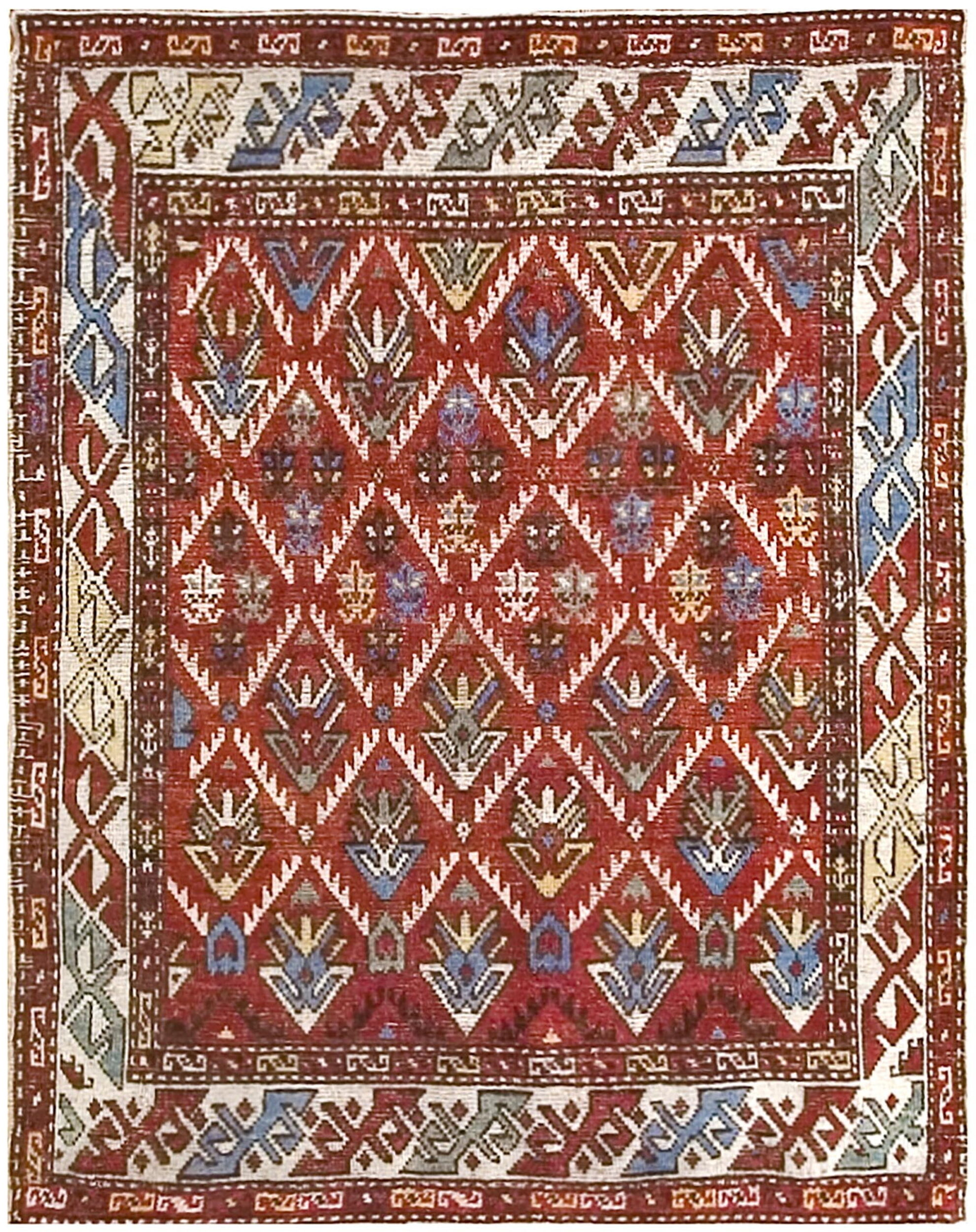 The complex border system frames the central panel with multiple guard stripes featuring abstract symbols and repeating X-motifs in contrasting ivory, blue, and pale yellow. This robust construction is typical of the kurdish weaving tradition, known for its durability and powerful, intuitive artistry, reflecting the weaver's personal interpretation of traditional motifs.