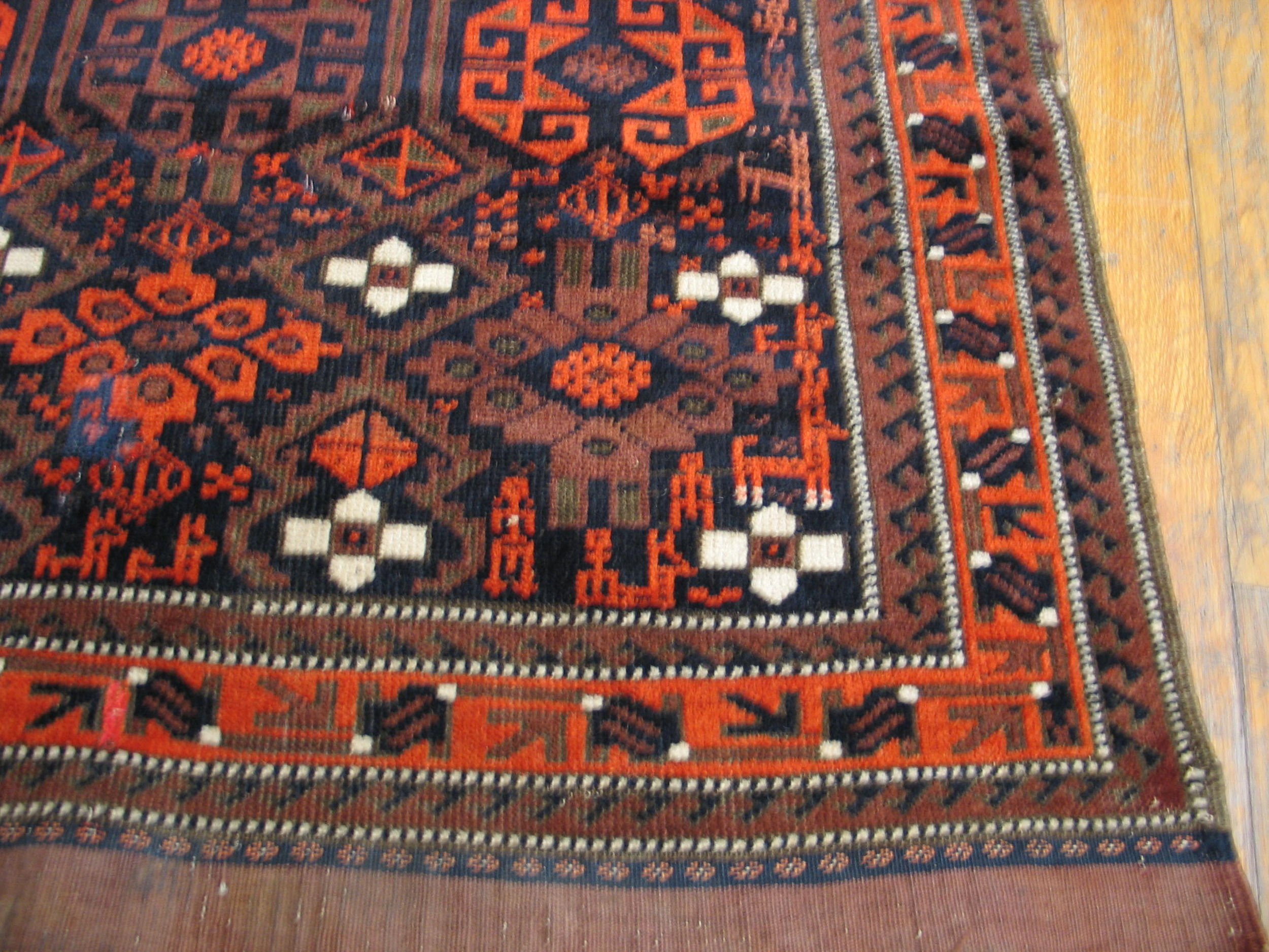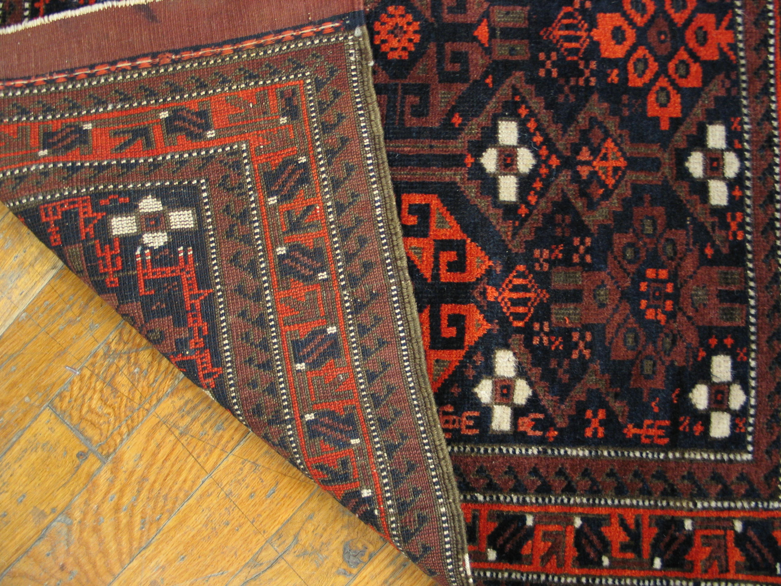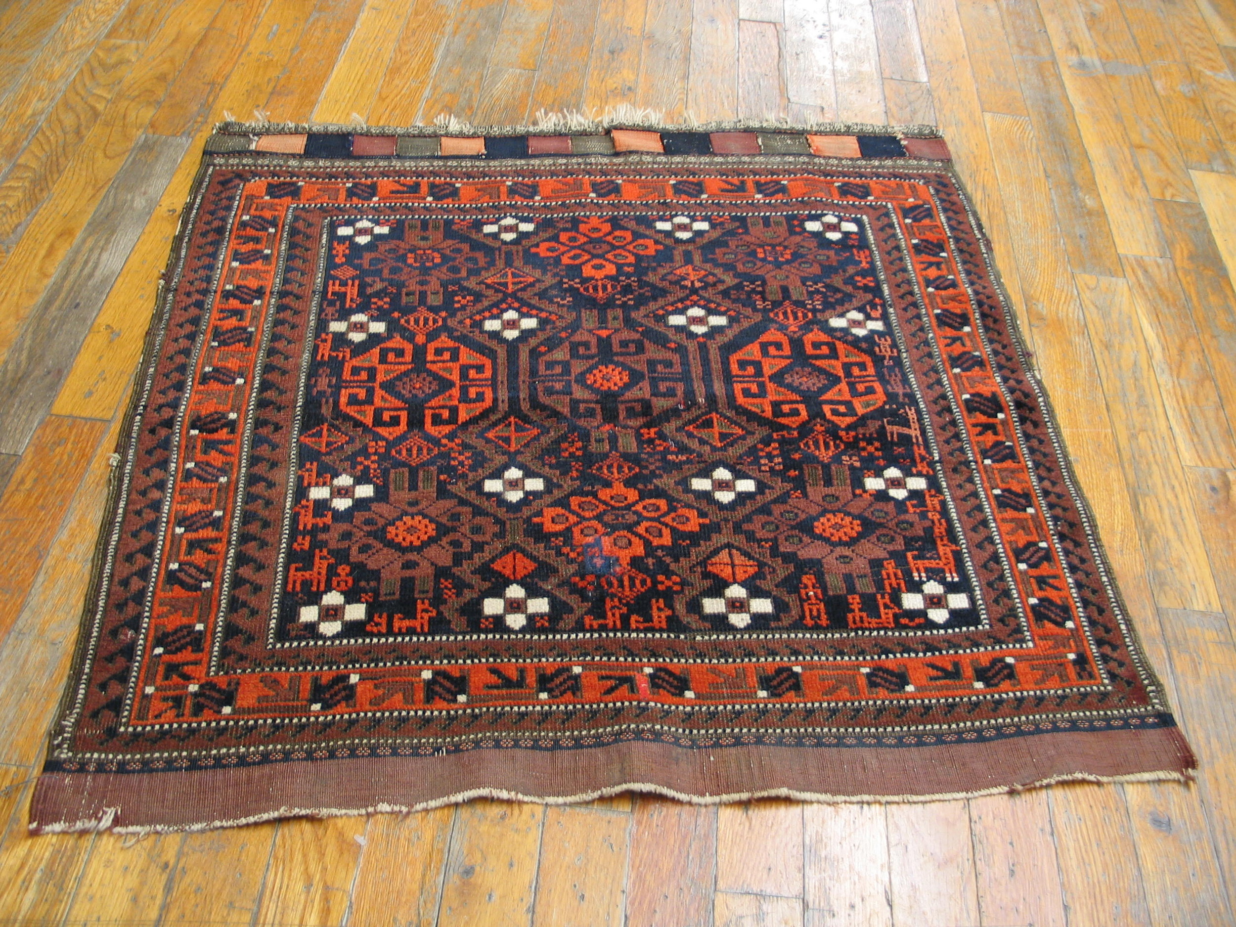 The compact dimensions classify this piece among small scatter size rugs, making it an ideal accent rug for a study, hallway, or beneath a small occasional table. Note the distinctive, finely woven kilim finish at the top edge, featuring alternating squares of color—a hallmark of authentic Baluch craftsmanship and a testament to its enduring quality.