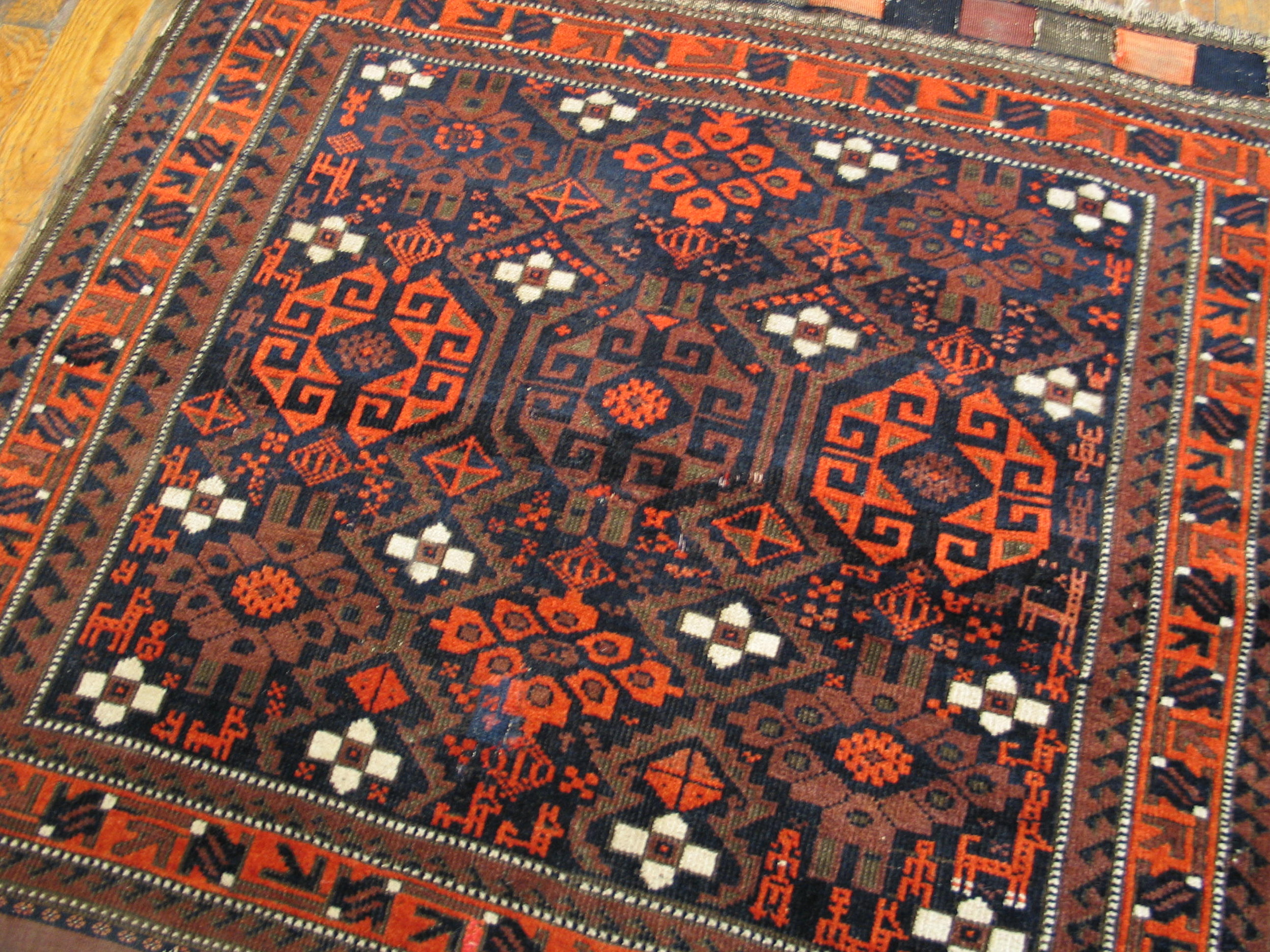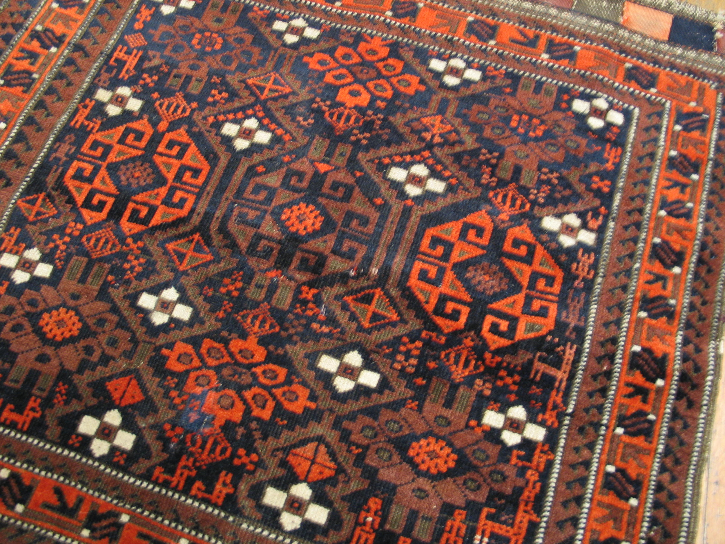 Antique Baluch Persian Knotted Rug, Circa Date: 1890s. This exquisite piece is a classic example of Baluch weaving tradition, originating from the borderlands of Persia in the late 19th century. The quality of the wool and the depth of the dye work mark it as a superior specimen among antique rugs.