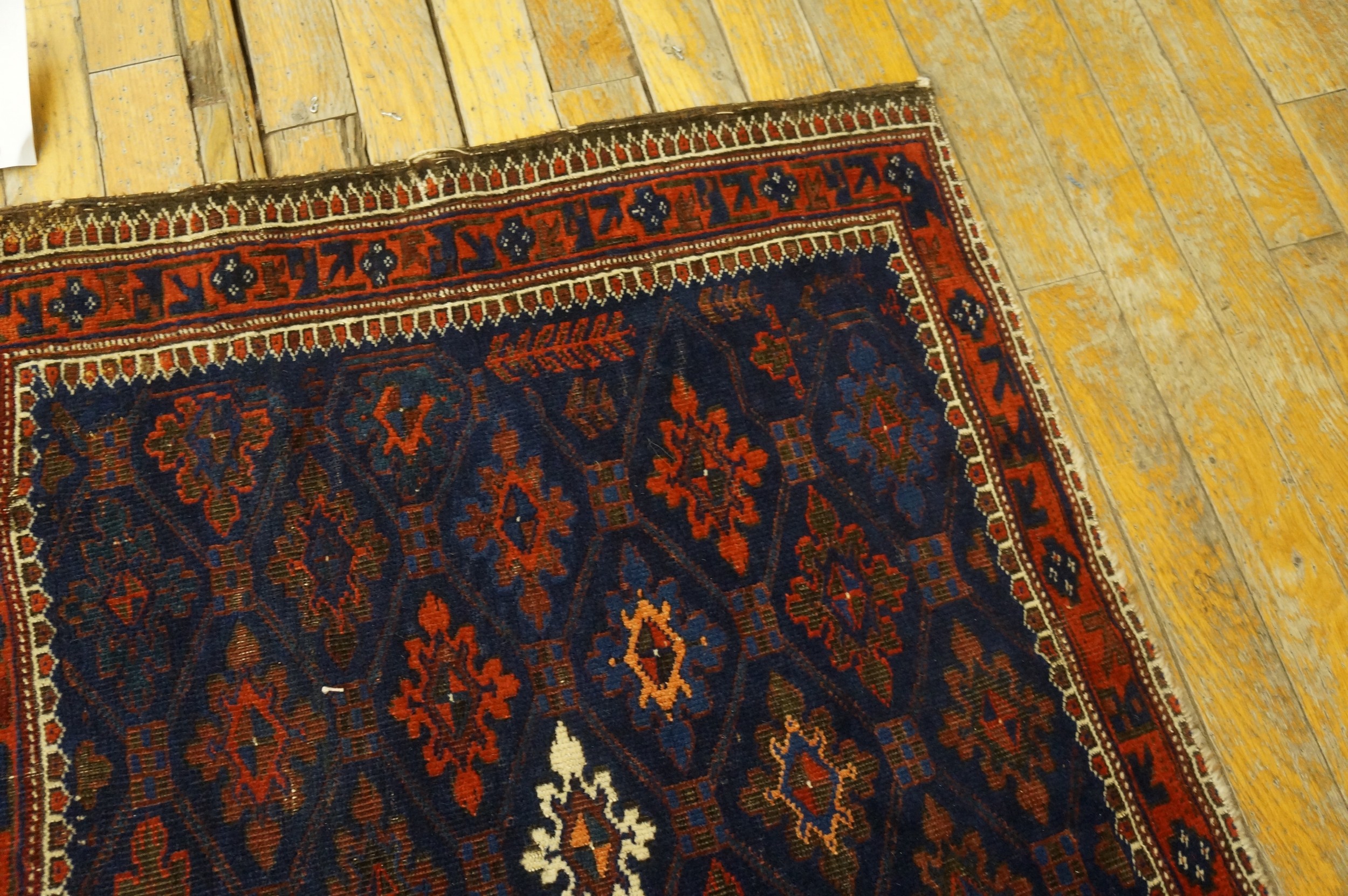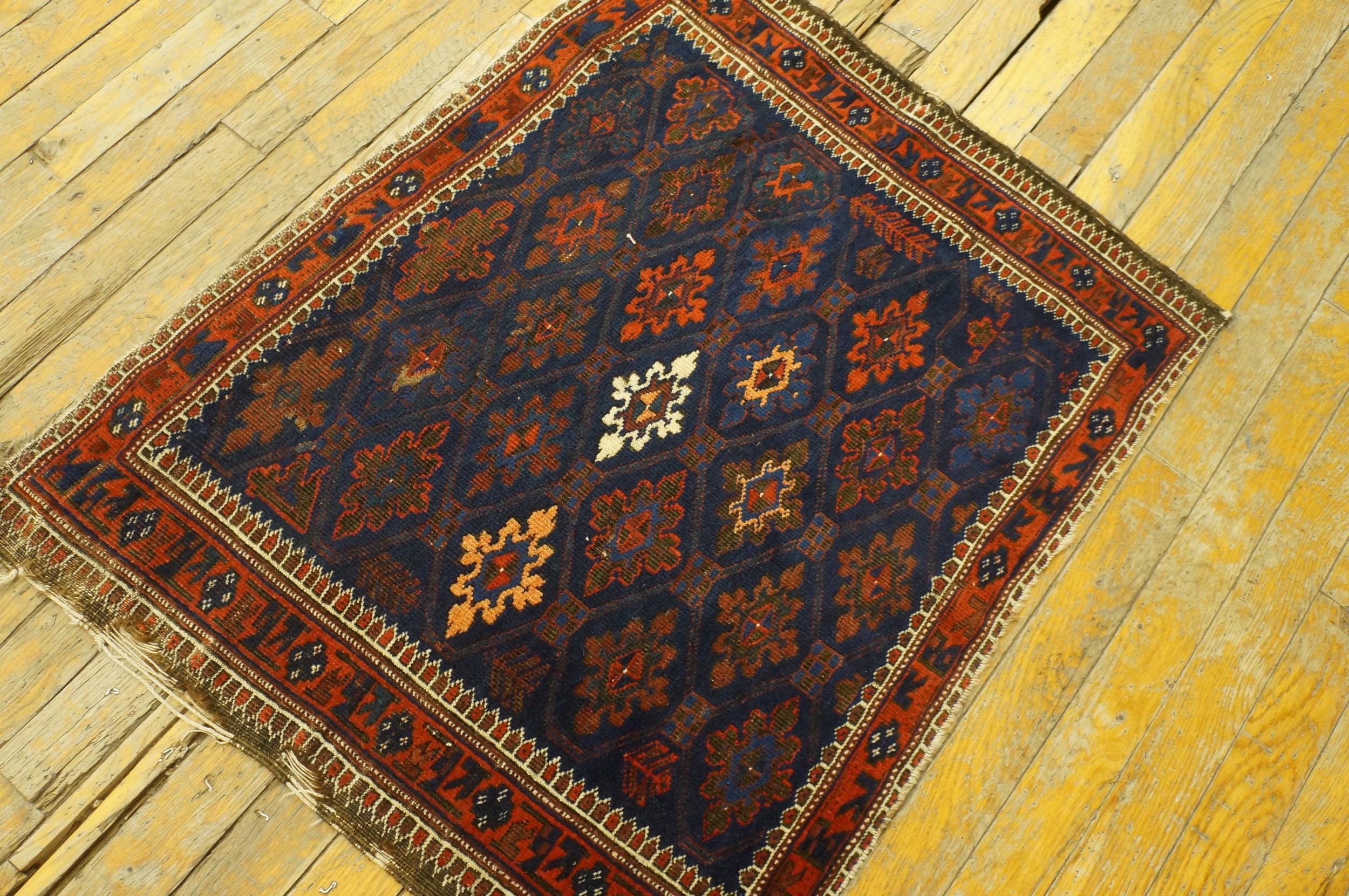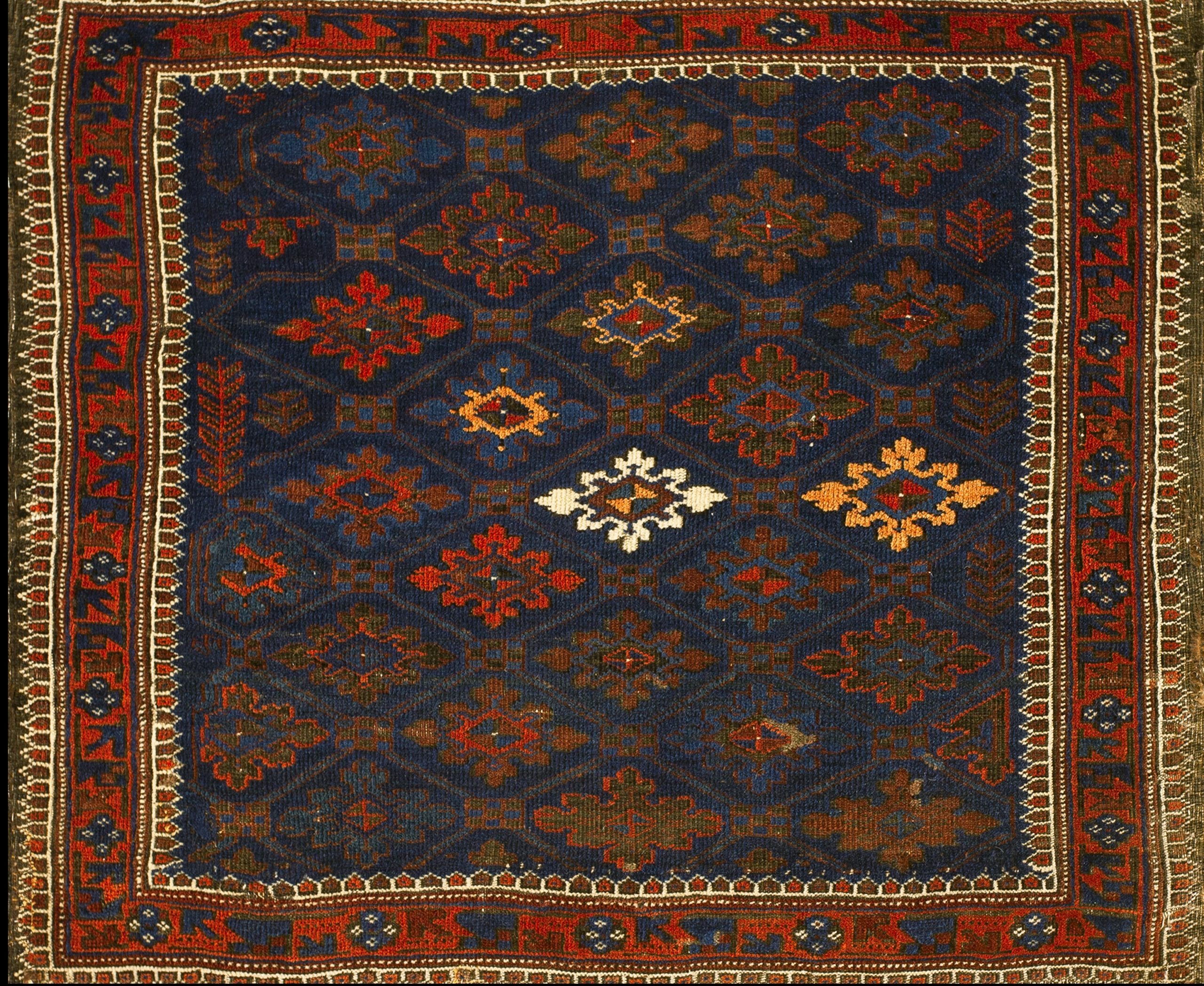 Antique Baluch Geometric Knotted Rug, Circa Date: 1900s. This exceptional piece exemplifies the nomadic weaving traditions of the Baluch tribes, known for their dense knotting and deep, saturated color palettes. Dating to the early 20th century, this textile is a superb example of antique rugs that retain their original tribal character and integrity.