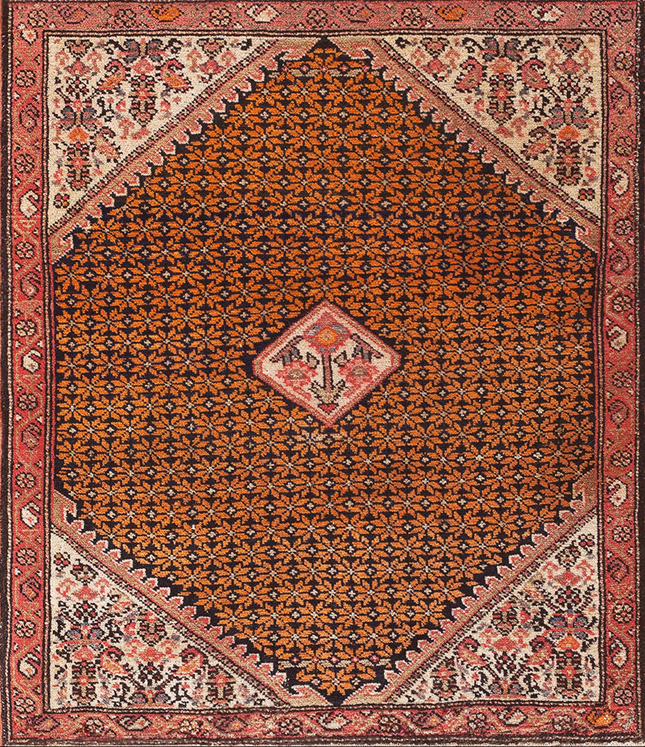 The complex corner spandrels, rendered in soft creams and rusts, frame the central field beautifully, providing a delicate contrast to the boldness of the primary colors. This finely preserved textile is a testament to the artistry found within our broader collection of antique rugs, offering both historical depth and immediate decorative appeal.