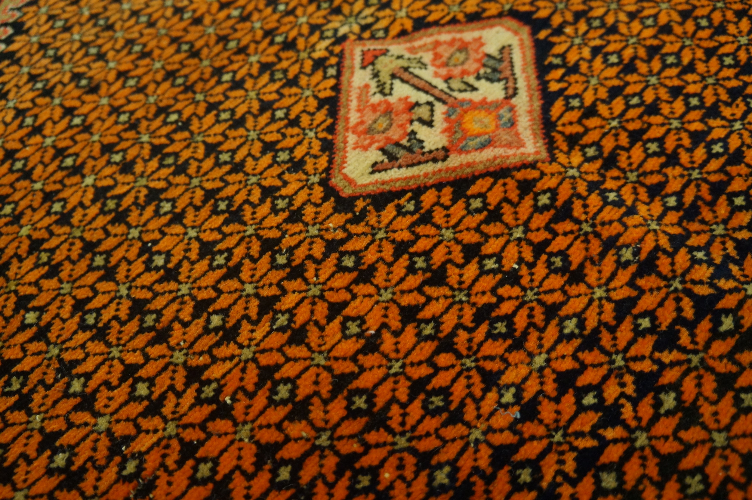 The palette is dramatically rendered, utilizing a rich, near-black indigo ground—qualifying it among our finest blue color rugs—which serves as a backdrop for the vibrant, saffron-toned repeating floral elements. This dense, continuous allover design fills the central diamond field, creating a mesmerizing visual texture.