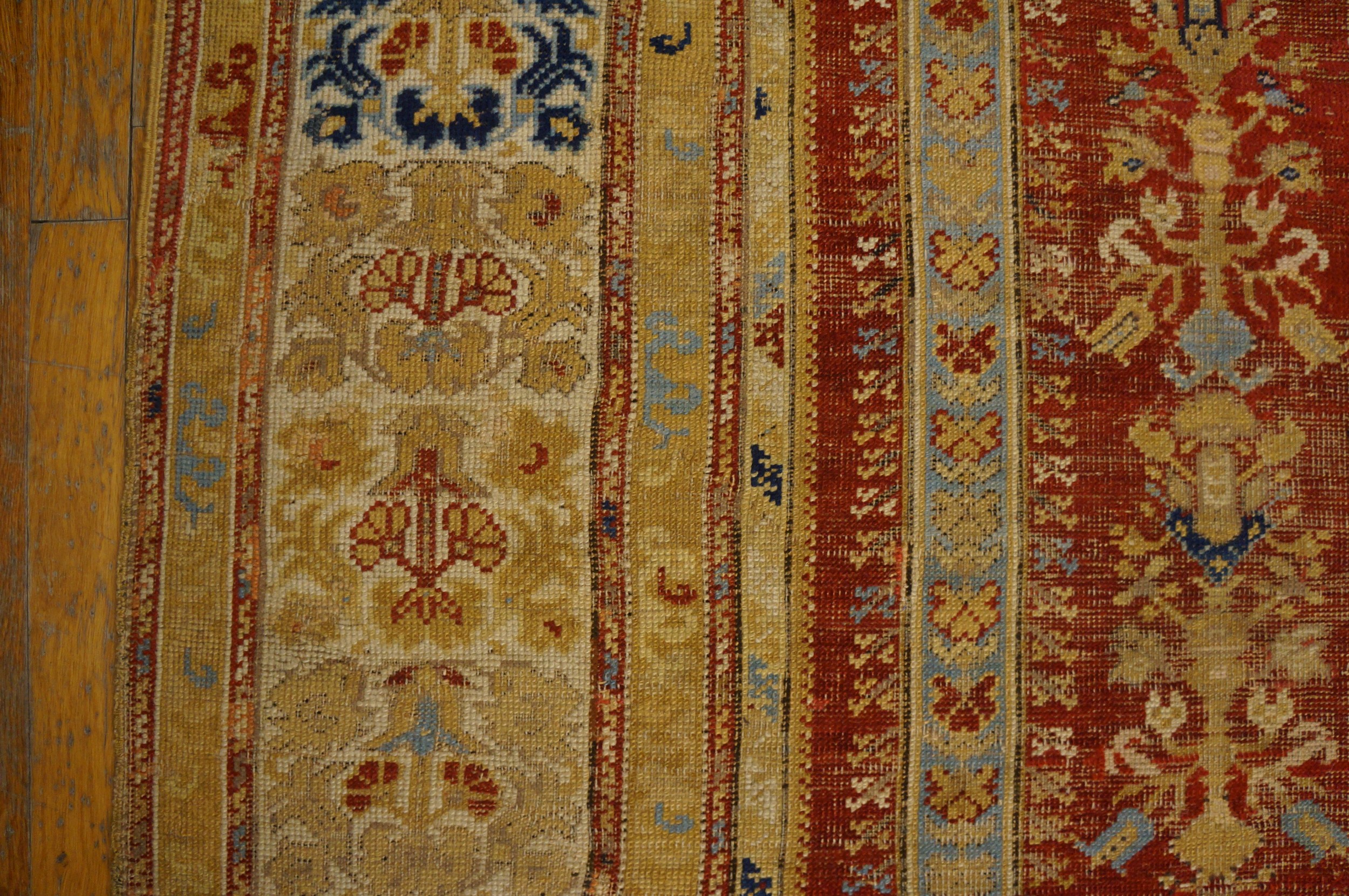 Surrounding the vibrant center is a complex system of multiple guard borders and a wide main border featuring repeating cartouches and stylized palmettes set against a light, sandy ground. The precise execution of the knotting highlights the intricate detail within the stylized floral and foliate elements, typical of high-quality workshop production from the Kuba region.