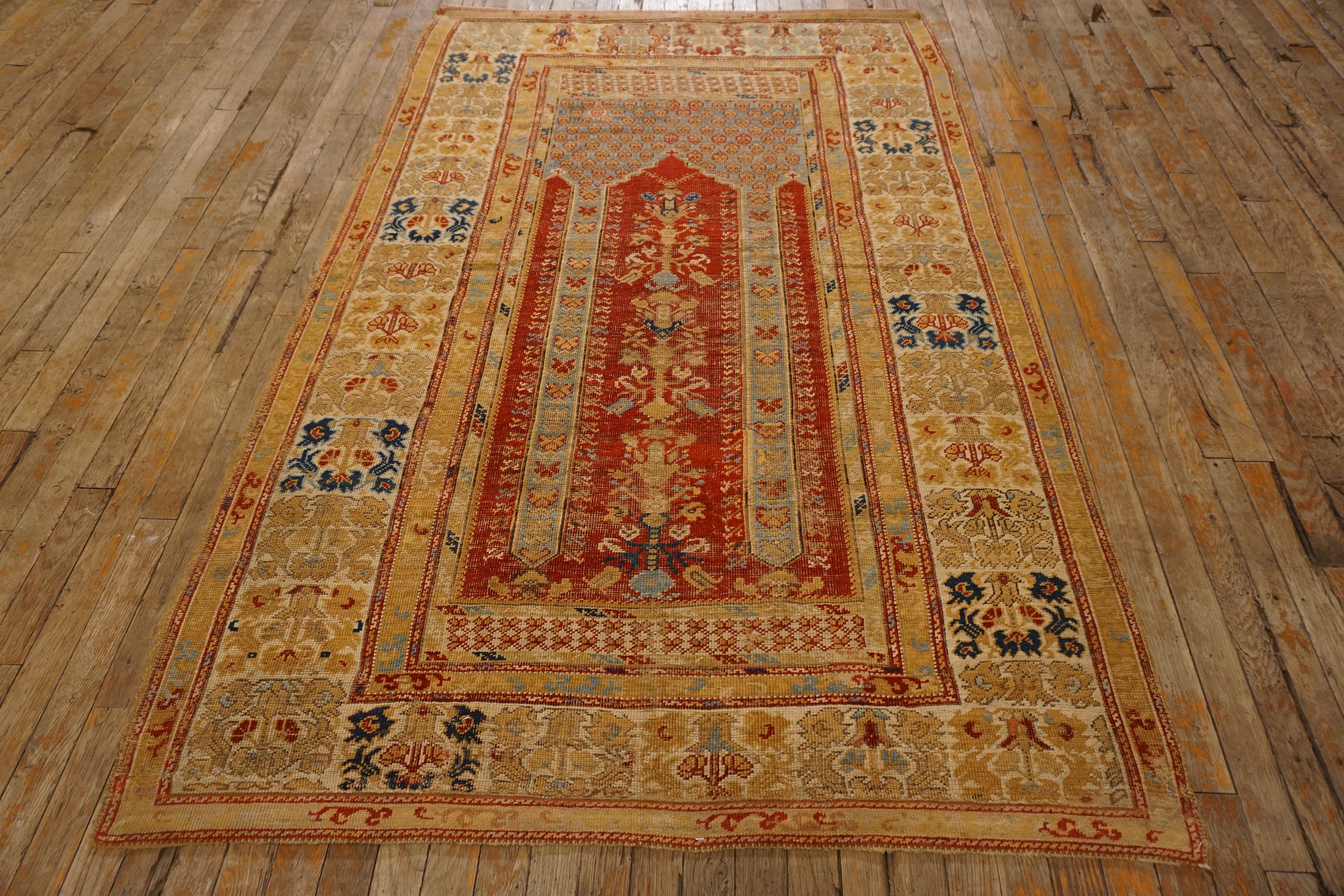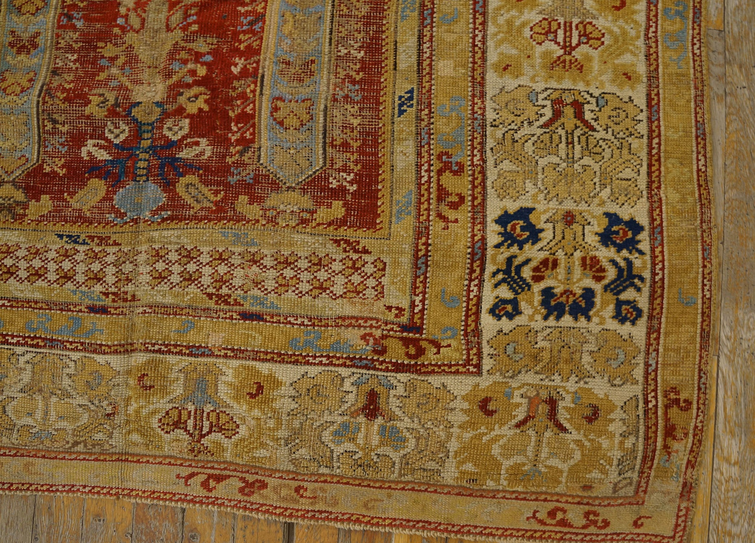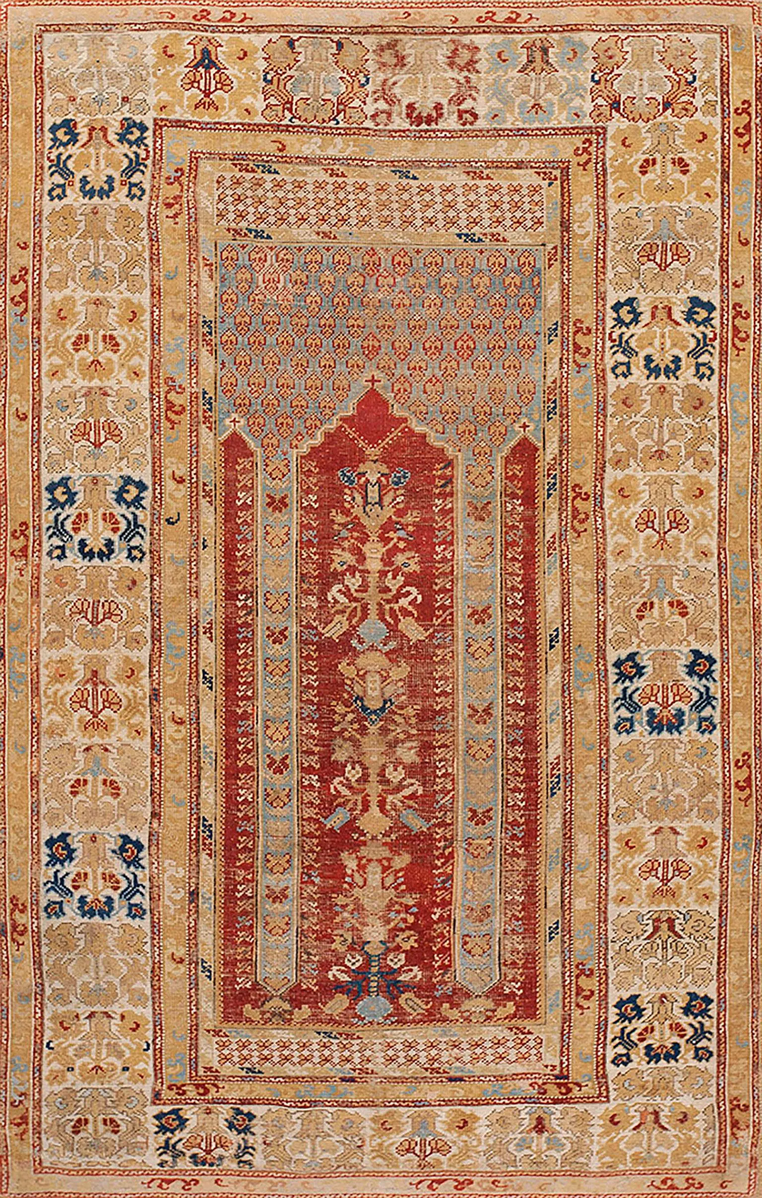 The palette is dominated by a rich, saturated field of rust red color, beautifully contrasted by accents of pale sky blue, deep indigo, and warm saffron yellow. The central field, highly stylized and elongated, suggests a prayer niche (mihrab) format, though the overall design is densely packed with repeating stylized motifs. The use of natural dyes provides a depth and variation in tone that modern reproductions cannot replicate.