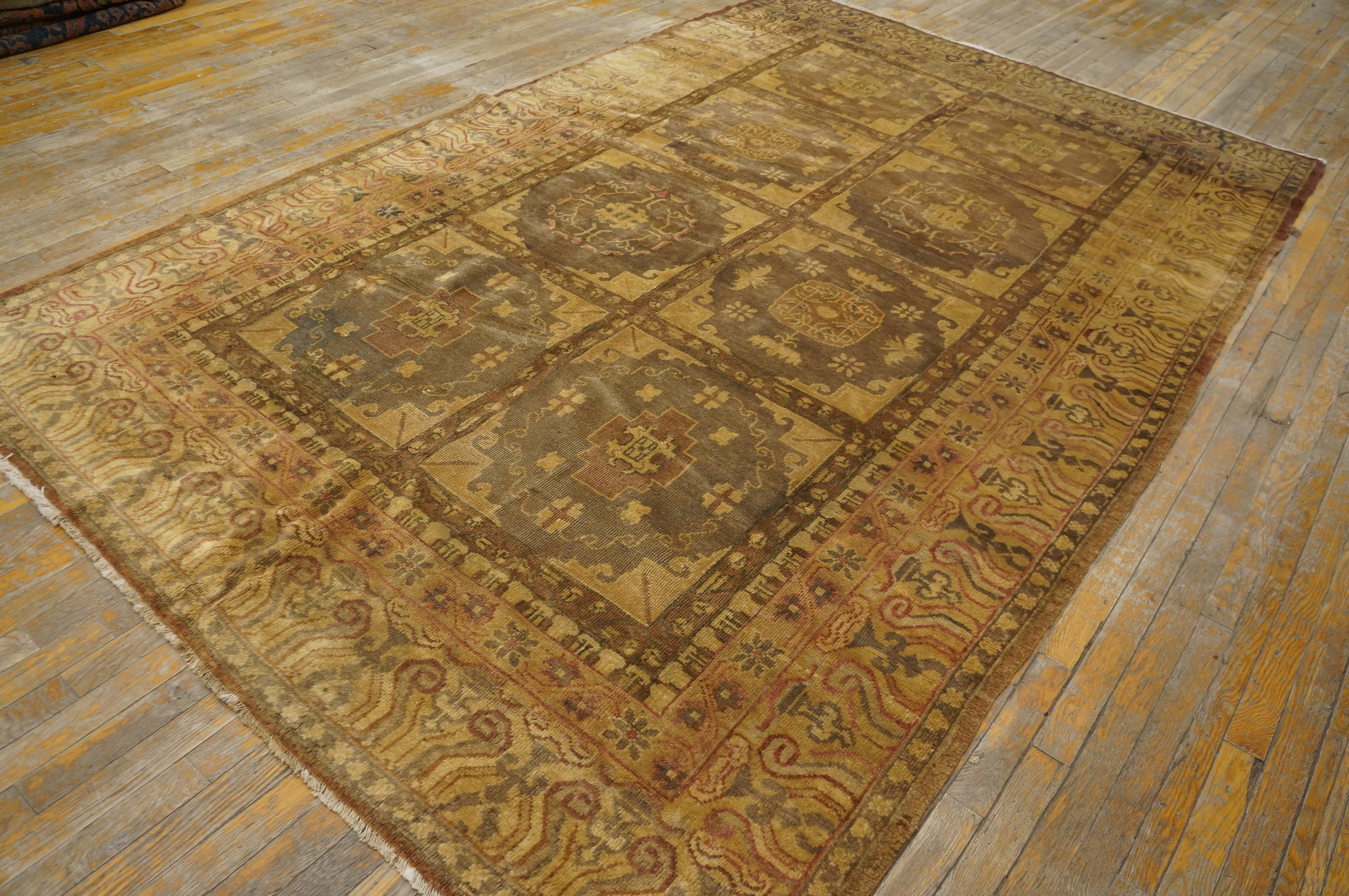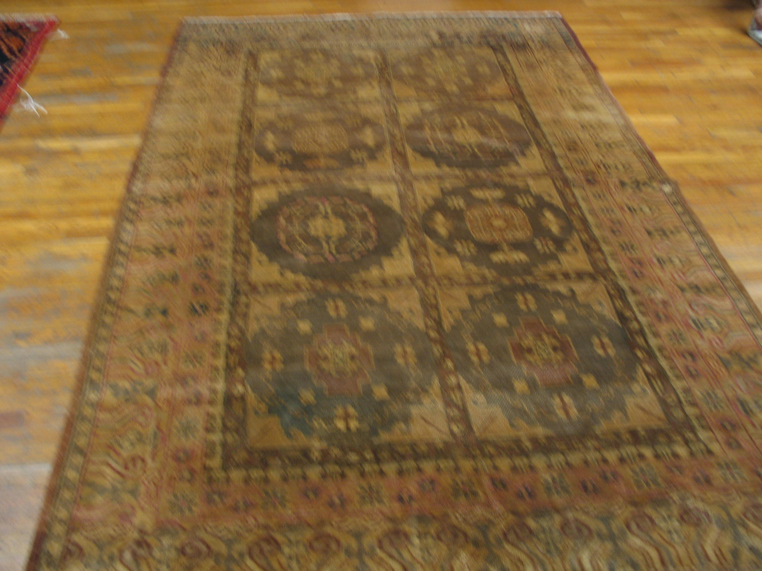 Antique Allover Geometric Wool Hand Knotted Pile Purple / Lavender Mauve 1930s East Turkestan Khotan Rug, Circa Date: 1930s. This exceptional example of antique rugs captures the restrained elegance of early 20th-century weaving. The hand-knotted wool pile exhibits a rich texture and subtle variations in color, characteristic of pieces created during this period of transition in textile art.