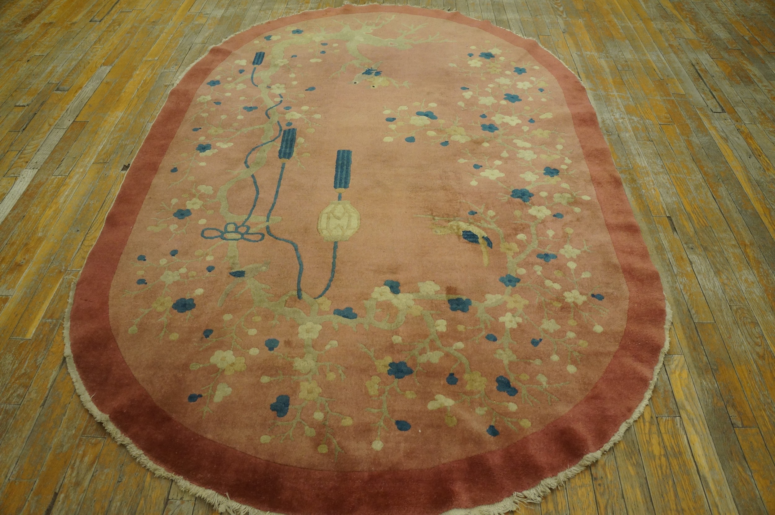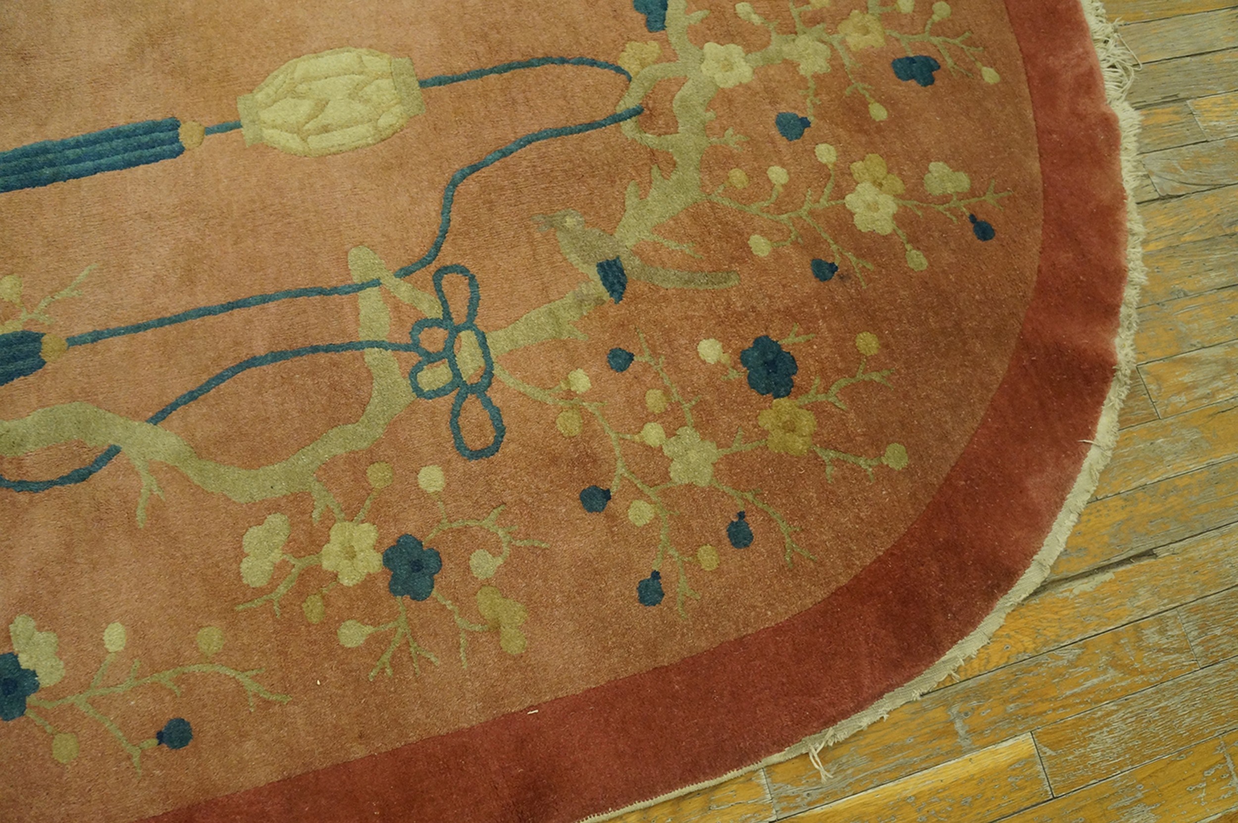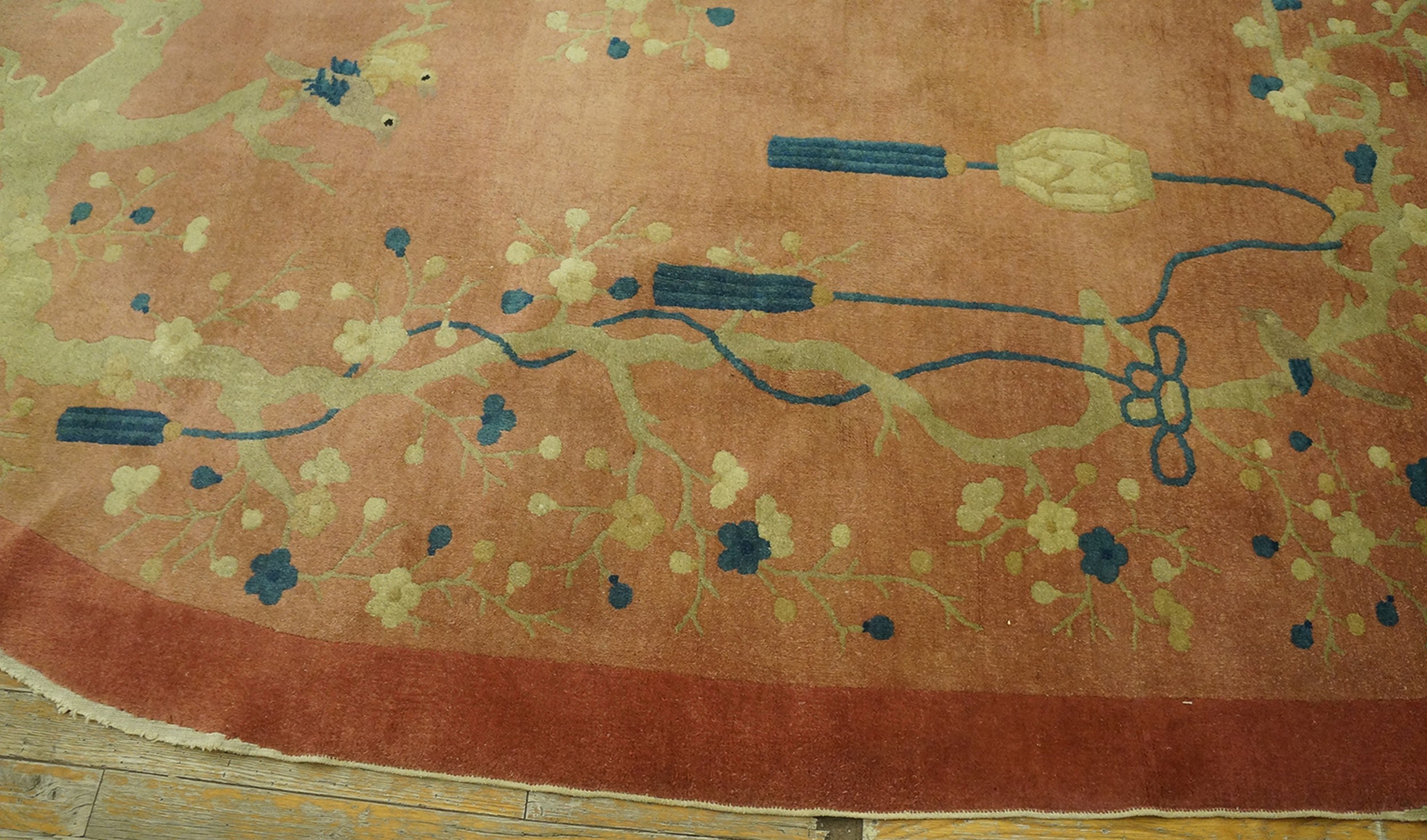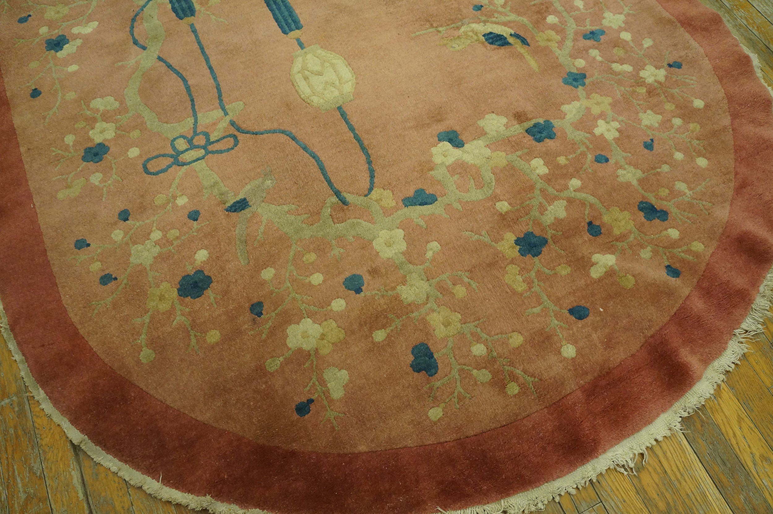 Antique Art Deco Chinese Allover Floral Salmon 1920s Rug, Circa Date: 1920s. This exquisite piece exemplifies the fusion of traditional Chinese motifs with the bold, simplified aesthetic of the Art Deco period. The oval format is characteristic of early 20th-century decorative antique rugs, designed to anchor seating areas or hallways with subtle grace.