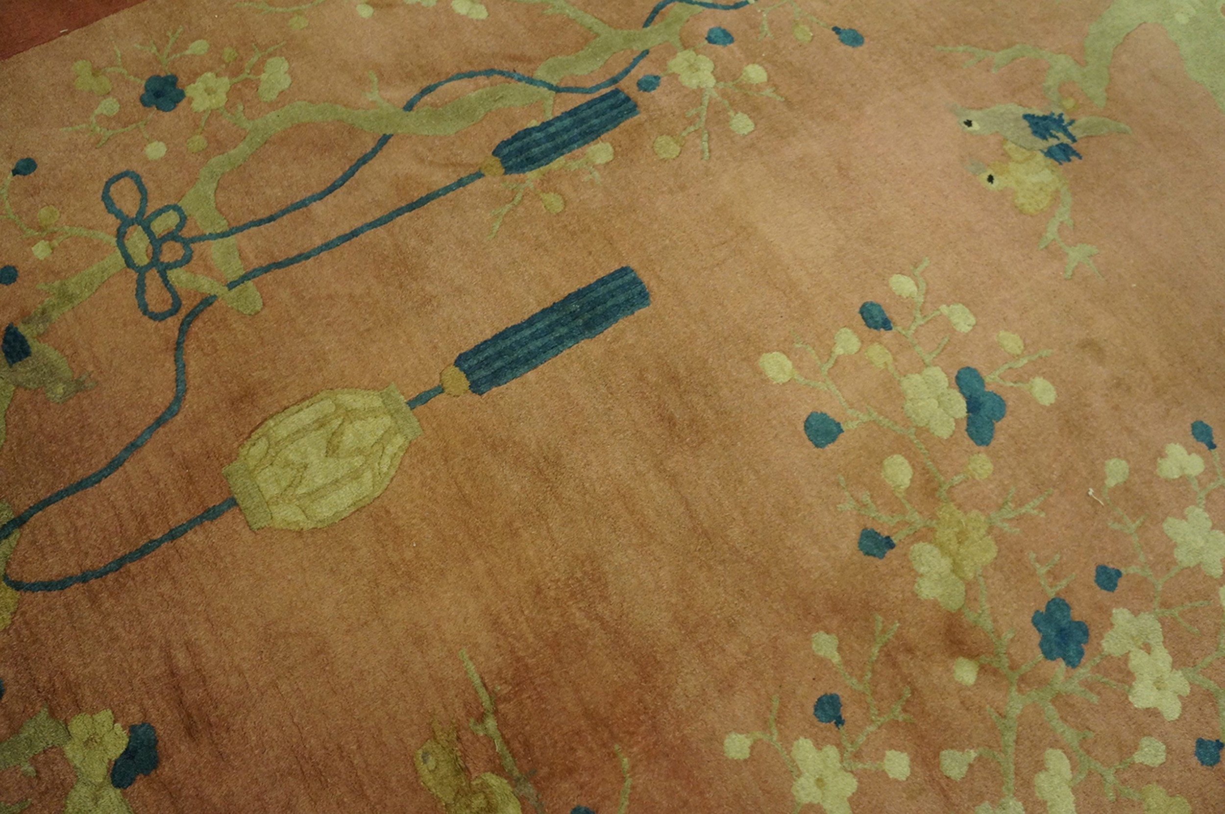 A delicate allover pattern of blossoming branches, stylized birds, and hanging lanterns cascades across the field. The motifs are rendered in soft sage greens and striking indigo blues, highlighting the stylized naturalism that defines the best Chinese Art Deco weaving. The composition maintains balance despite its asymmetry, a hallmark of the era’s departure from classical symmetry.