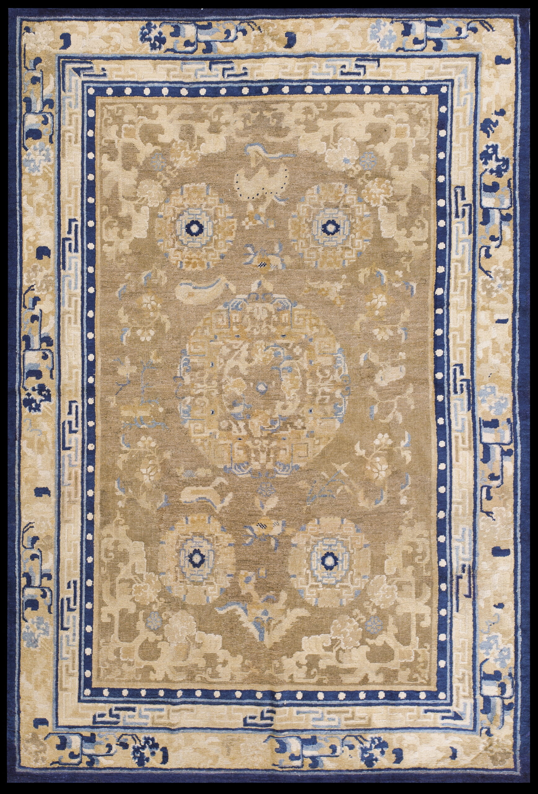 Traditional Chinese iconography dominates the field, centered around a stylized medallion and surrounded by repeating roundels rendered in soft blues and tans. The outer guard border incorporates delicate scrolling vines and floral motifs, providing a naturalistic counterpoint to the rigid geometry of the inner fretwork band, all framed by a striking indigo reserve.