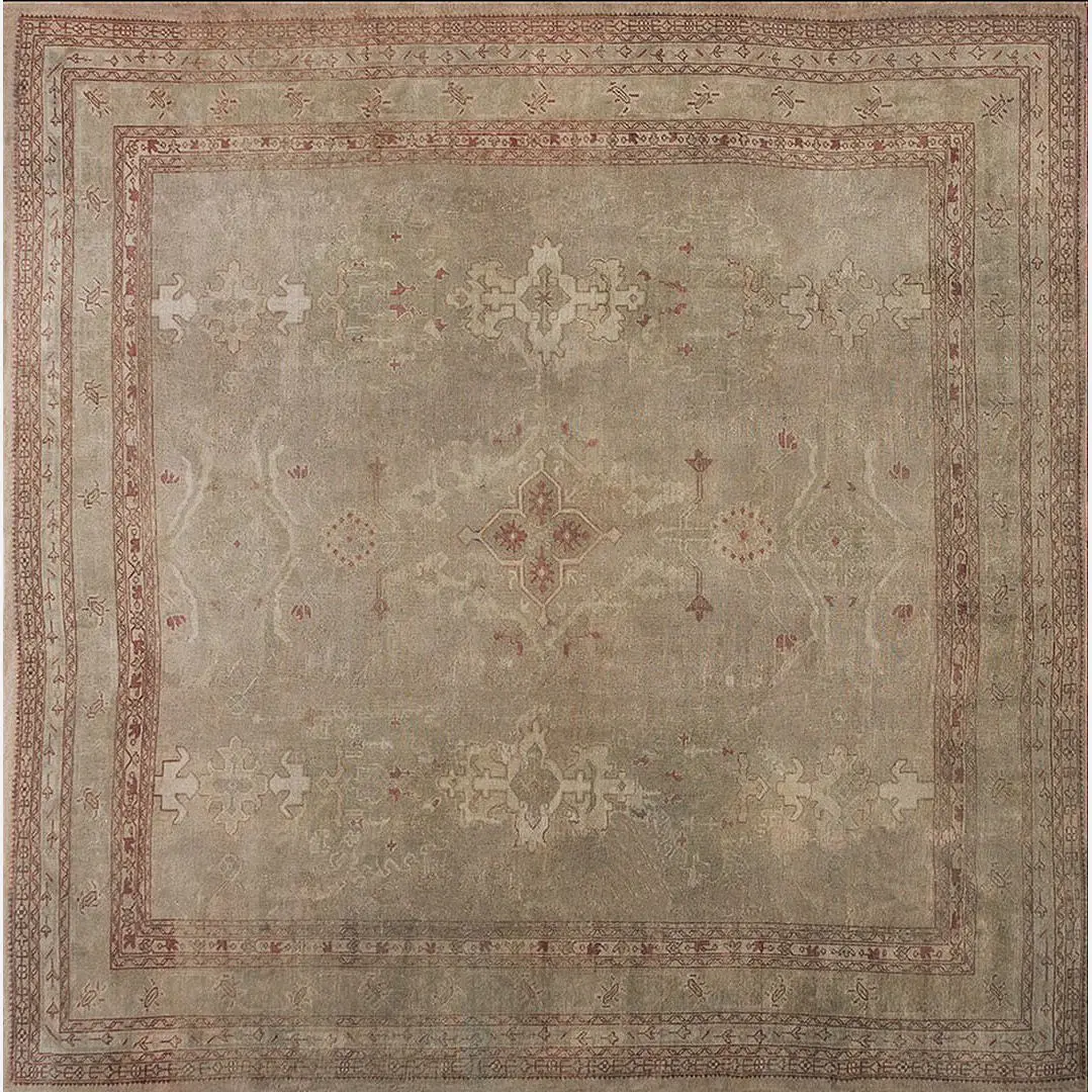 Whether placed as a centerpiece in a square-laid room, layered over a larger foundation rug, or used to punctuate a conversation area, this Turkish Oushak piece brings historic depth, decorative balance, and quiet sophistication to your home. Its soft gray palette and geometric design make it especially well-suited to interiors that seek understated elegance and enduring style.