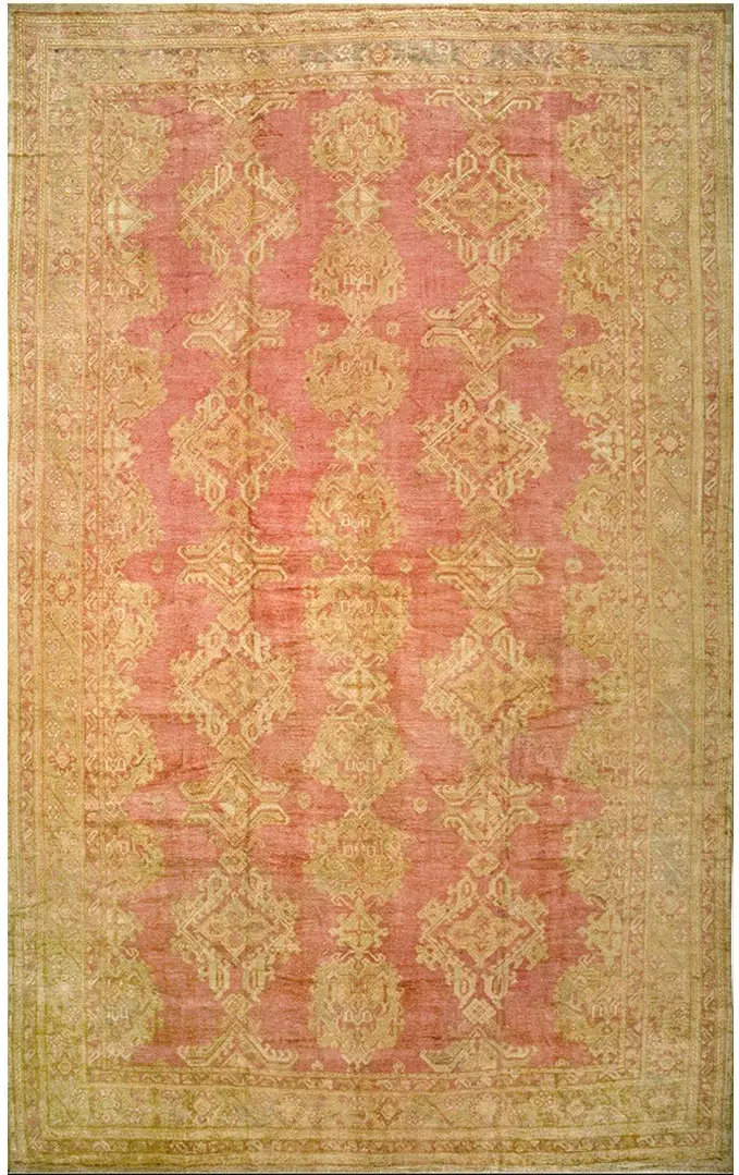 This soft pink rose color tribal large-scale allover design oversized antique Turkish Oushak rug is a striking example of classic antique Turkish rugs that harmonizes bold pattern, refined color, and generous scale. Hand-knotted in the Oushak tradition, this big oversized carpet features a beautiful rosy field paired with a large-scale tribal allover motif, offering both visual warmth and decorative presence in spacious interiors.