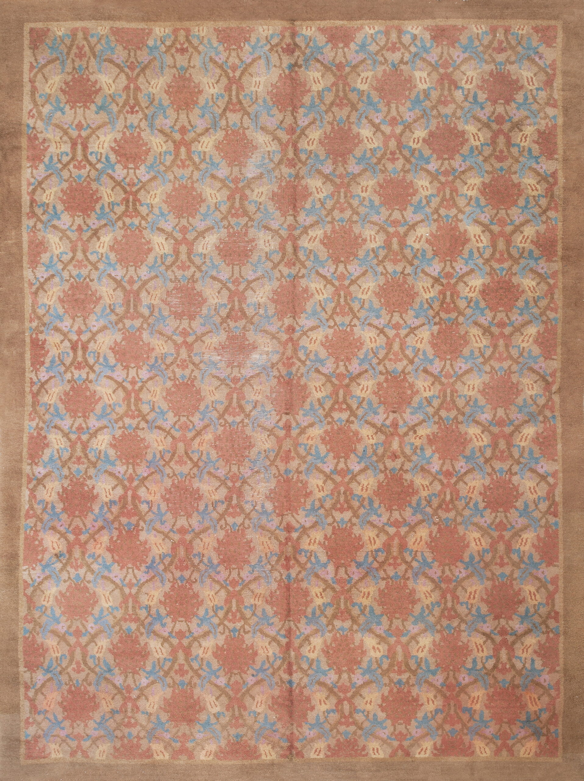 The colorway is particularly refined, utilizing a foundation of soft beige and taupe, accented by striking coral-red medallions and delicate powder-blue foliage. The gentle fading and patina are consistent with its age, lending depth and character to the wool pile. Presented in a generous room-size format, this textile is perfectly suited to anchor a sophisticated living area or grand reception room.