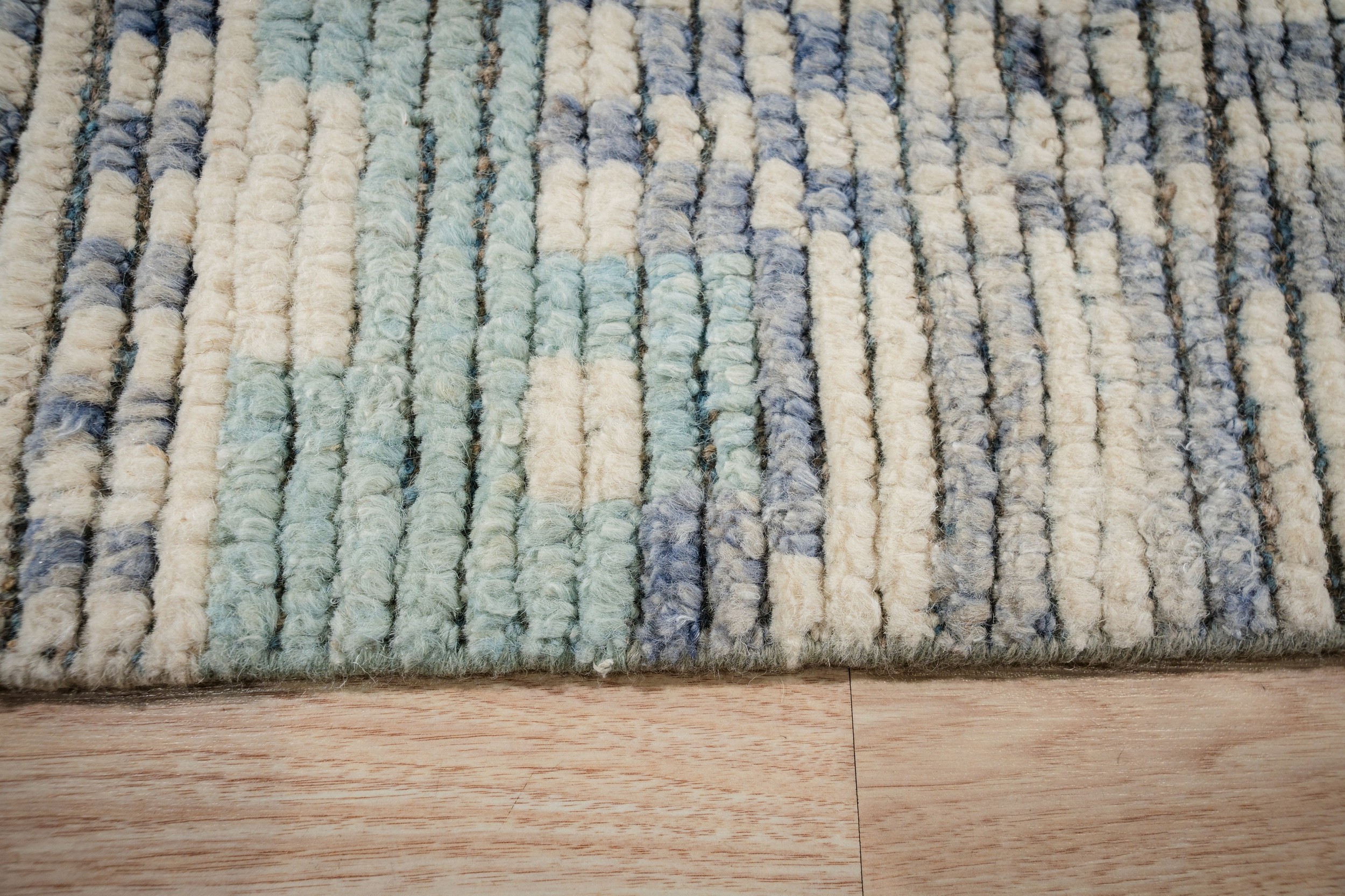 Abstract blocks of dense blue shading anchor the composition, juxtaposed with open areas that emphasize the plush wool pile. This dynamic interplay of negative space and bold geometric forms makes the Marrakech Painted Dusk an ideal statement piece, perfectly scaled for grand living areas and other room size rugs applications.