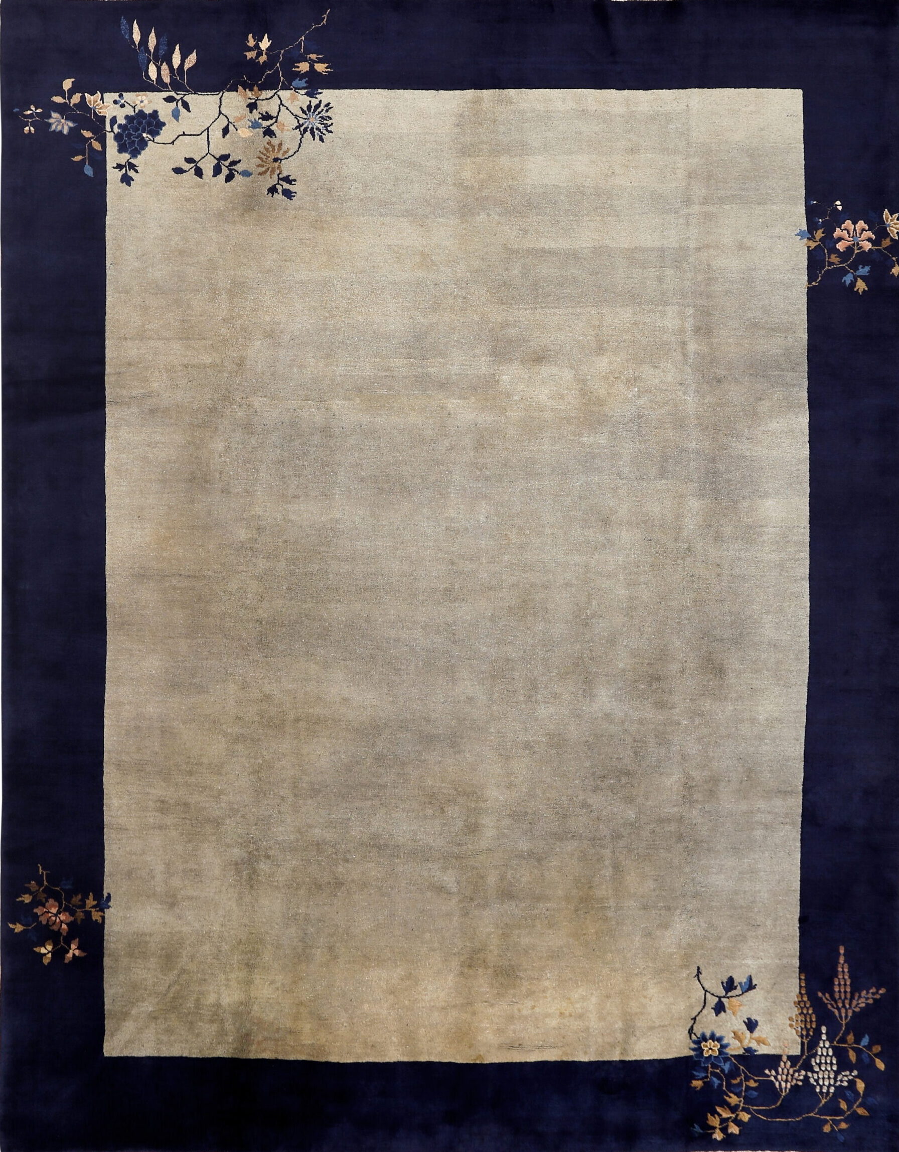 The central field, described as Peking Chinese Gray, presents a subtle, warm taupe or beige hue, demonstrating the delicate patina often prized in gray color rugs from this era. This expansive, open ground provides a perfect counterpoint to the deep indigo or navy border, creating a striking contrast that defines the rug’s architectural presence.