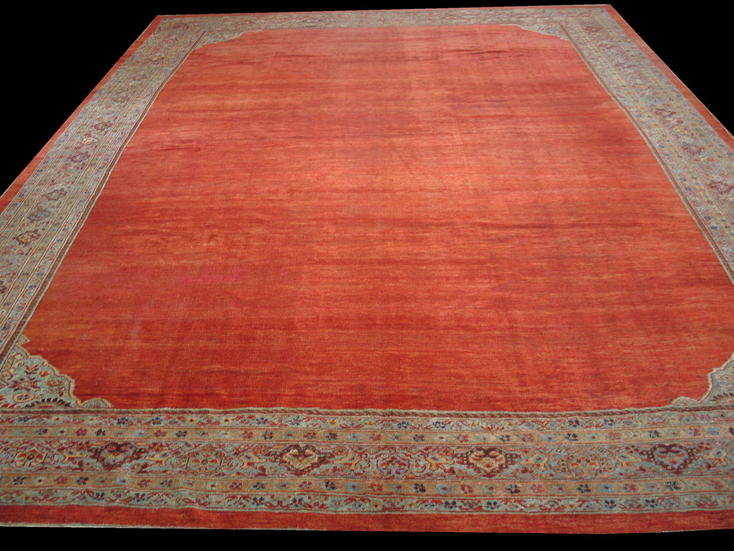 Antique Large Sultanabad Persian Knotted Rug, Circa Date: 1890s. This magnificent example of 19th-century Persian weaving presents a monumental field of saturated color, characteristic of the finest pieces produced in the Arak region. Its impressive dimensions qualify it as a truly large, oversized rug, designed to anchor a grand interior space with historical elegance and commanding presence.