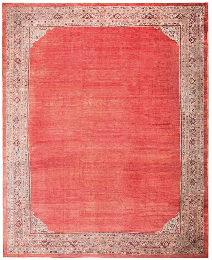 The expansive, nearly monochromatic field utilizes a stunning palette of deep madder, placing it among the most desirable salmon, coral, and pink color rugs available from this period. This bold use of color is expertly balanced by the intricate border system, which features delicate, repeating geometric motifs rendered in pale blue, ivory, and taupe, offering sophisticated visual relief against the vibrant central ground.