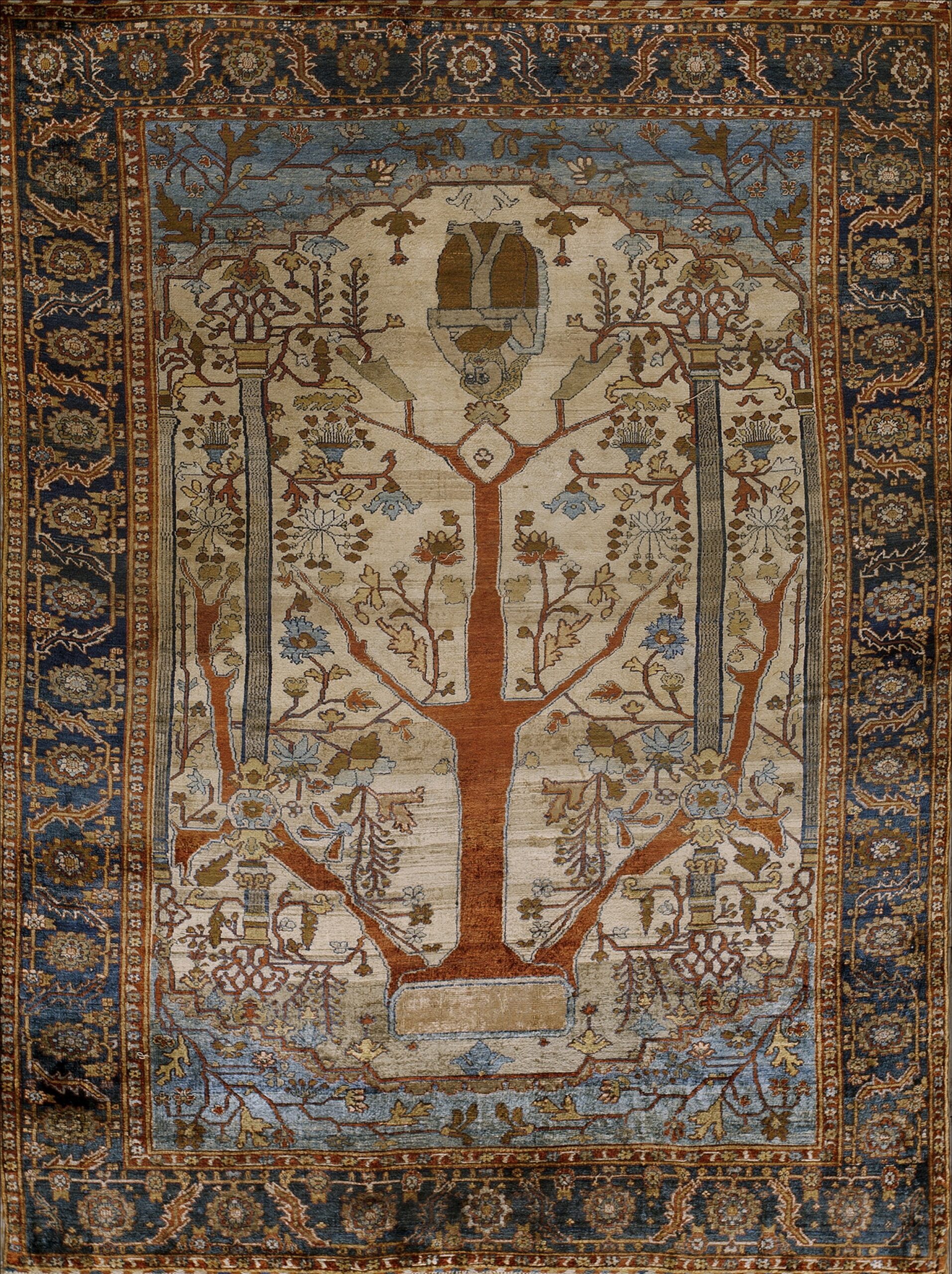 The primary field features a striking Tree of Life motif, rendered in rich sienna and rust tones, symbolizing eternal growth and connection. Flanking the central trunk are stylized columns and vases overflowing with meticulously drawn botanical elements, creating a sense of architectural symmetry rarely achieved in nomadic or semi-nomadic weaving traditions.