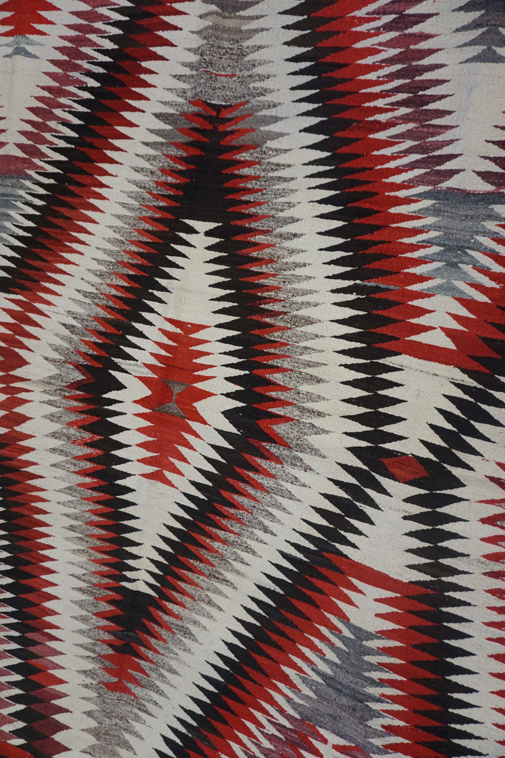 The flat weave construction highlights the dramatic interplay of color. A vibrant palette of deep crimson, charcoal black, and muted gray contrasts sharply against the field of natural, undyed ivory color rugs. The precision of the interlocking triangles creates a mesmerizing optical effect, typical of transitional period weaving, where traditional motifs began to incorporate more complex visual movement.