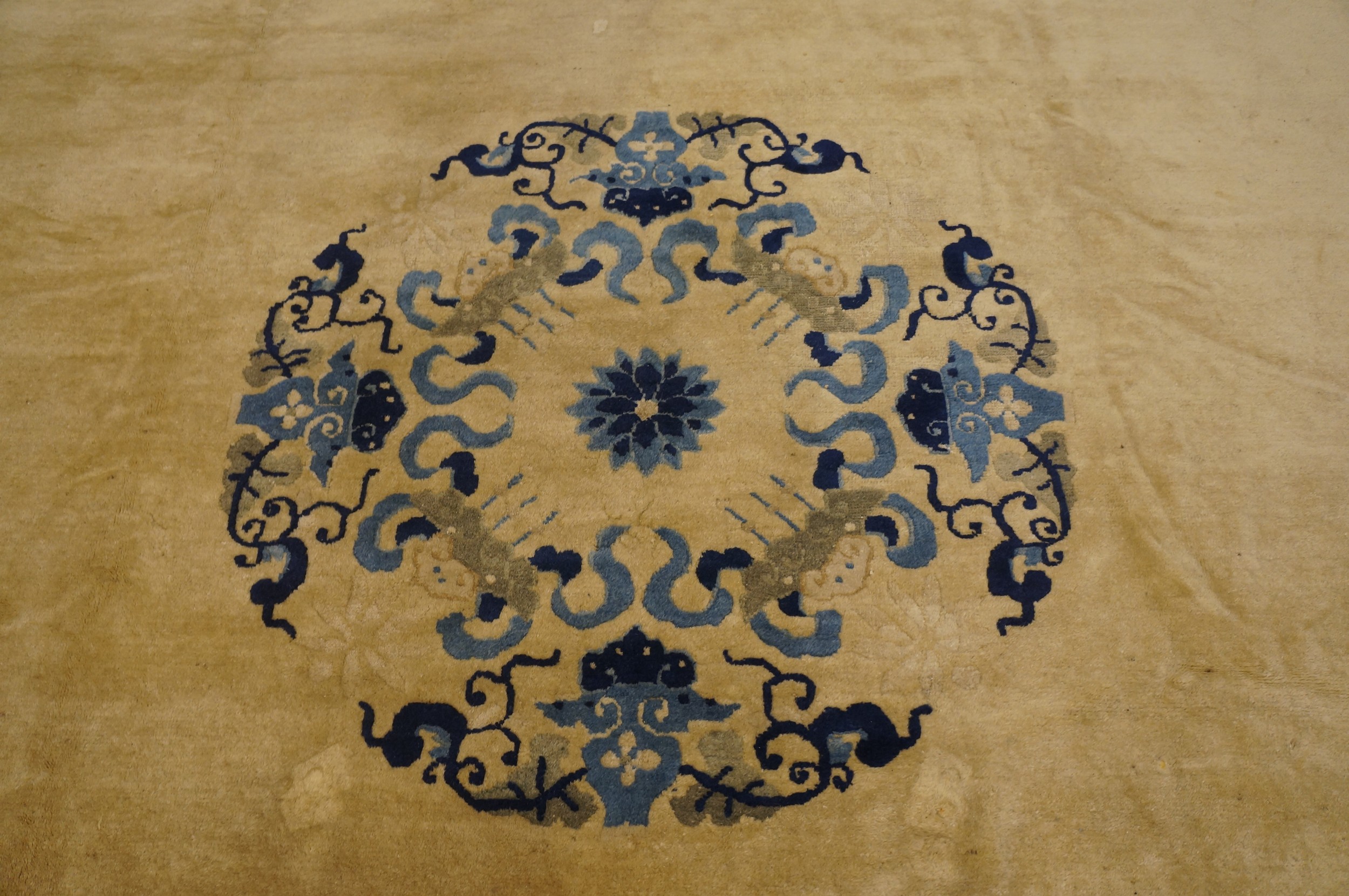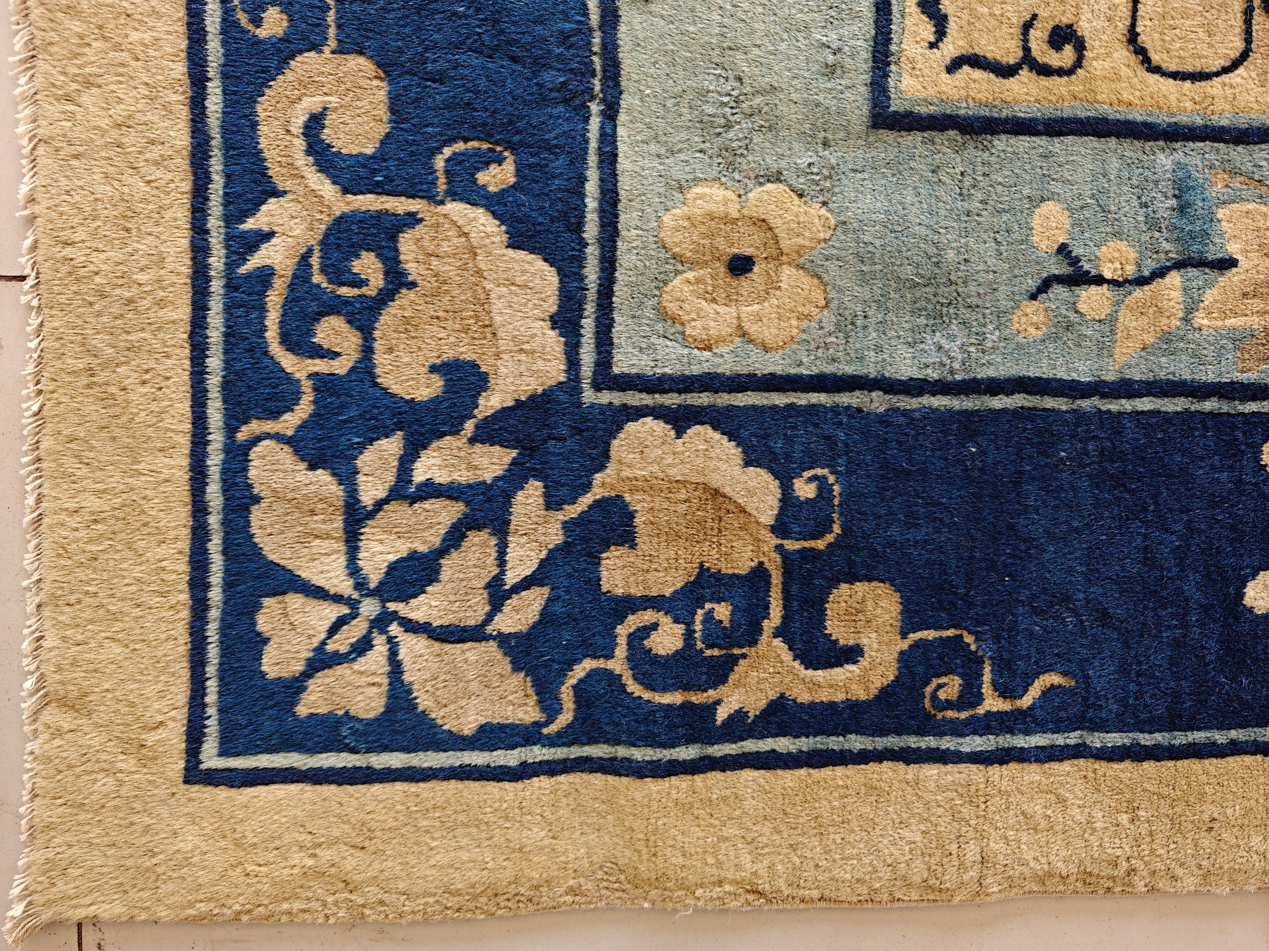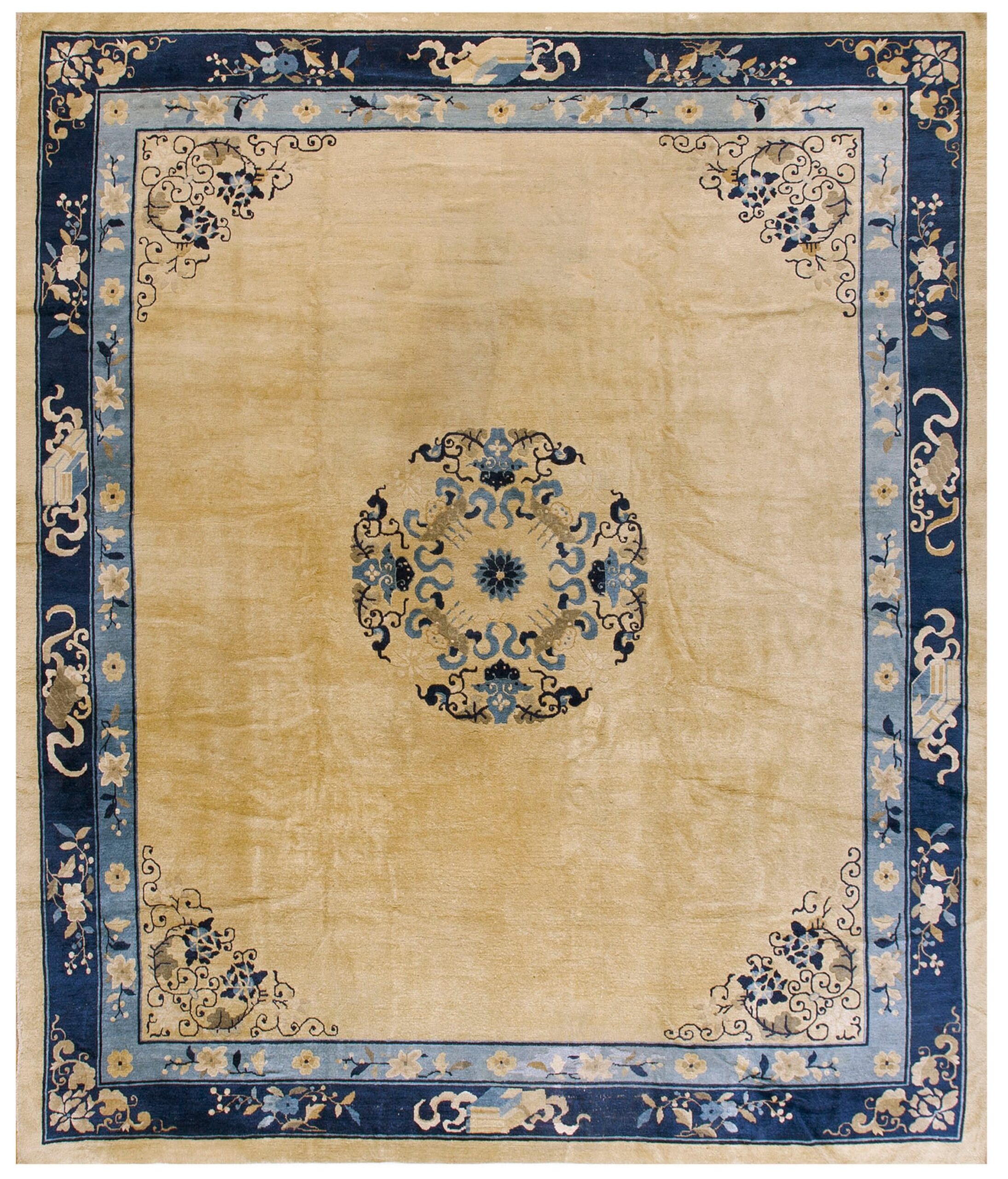 Characteristic of the period’s refined aesthetic, the design employs a minimal central motif—a stylized floral medallion—balanced by intricate corner spandrels. The triple border system features delicate floral sprays and subtle geometric cloud bands, demonstrating precise execution and artistic restraint.