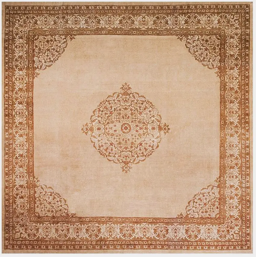 This square shape light ivory color room size open field medallion antique Indian Agra carpet is an elegant and versatile example of the beautiful rugs from India that brings timeless design and refined presence to spacious interiors. Woven in the celebrated Agra tradition, this carpet blends a serene color palette with a thoughtfully composed medallion motif, making it ideal for rooms that benefit from both visual balance and architectural grounding.