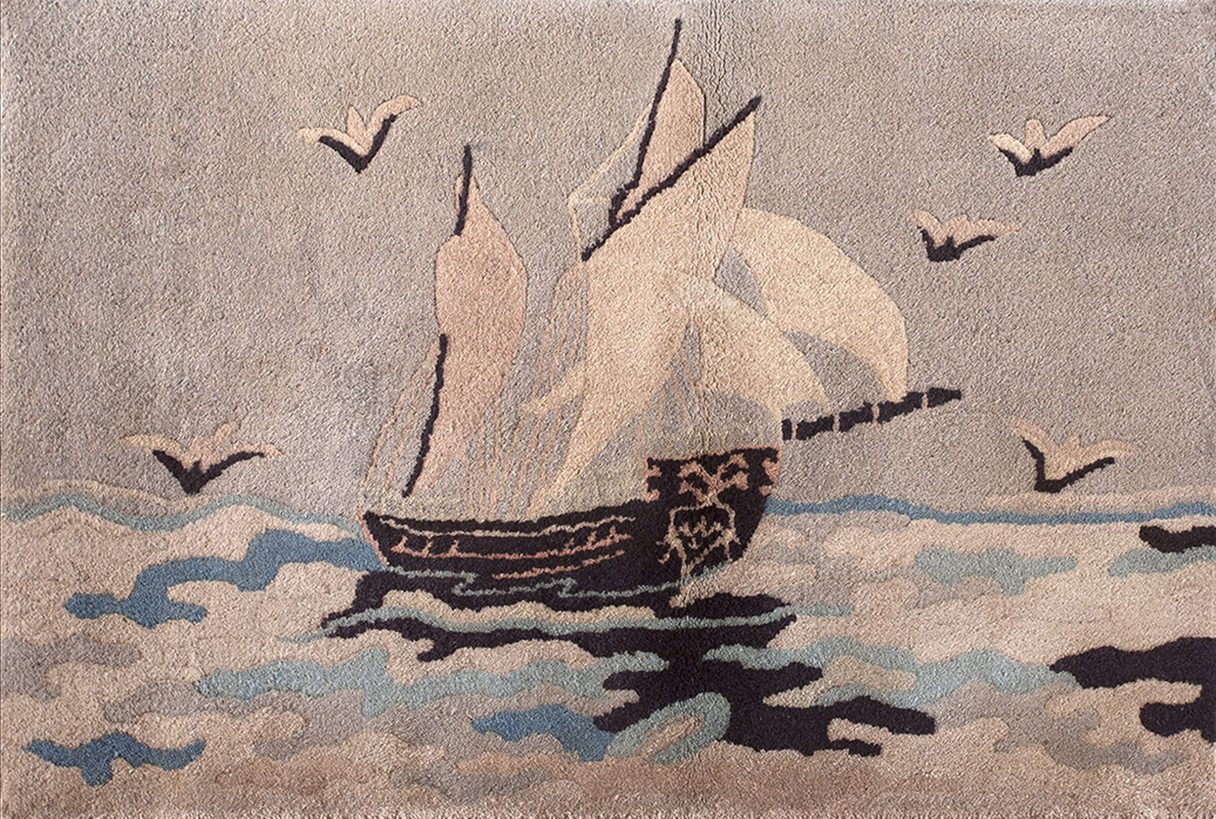 The composition is dominated by a majestic sailing vessel, rendered in deep charcoal and soft ivory tones, navigating stylized waves of taupe and pale blue. This evocative maritime scene is highly unusual among antique rugs of the period, suggesting it may have been a custom commission reflecting the growing influence of global trade routes on Chinese artistry.