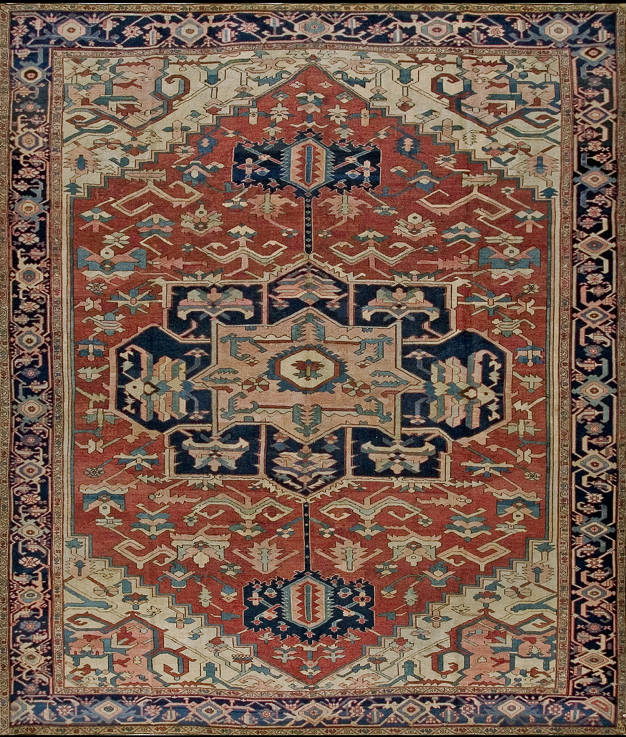 Antique Serapi Persian Ivory 1880s Rug, Country of Origin: Iran / Persia, Circa Date: 1880s. This exceptional Serapi exemplifies the finest weaving traditions of Northwest Iranian Persian rugs, characterized by its robust construction and sophisticated, large-scale geometric design. The clarity of the drawing and the quality of the wool underscore its provenance from the highly regarded weaving centers near Arak.